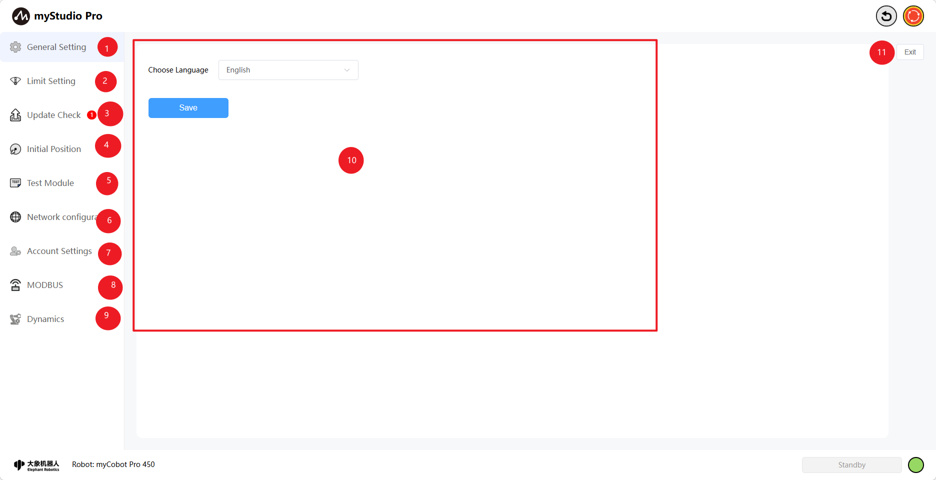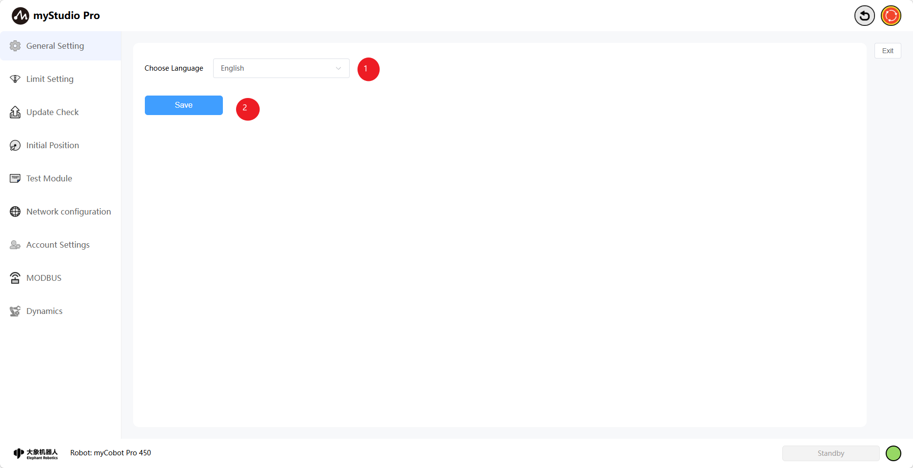 Click the General Settings icon button to enter the language settings page. Language selection supports Chinese and English.