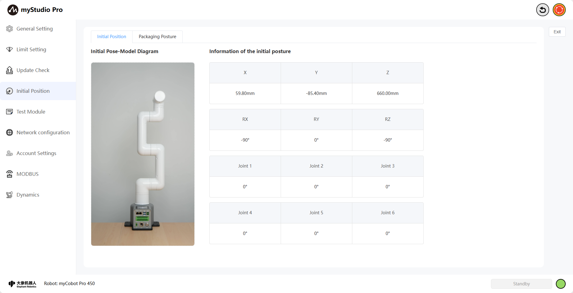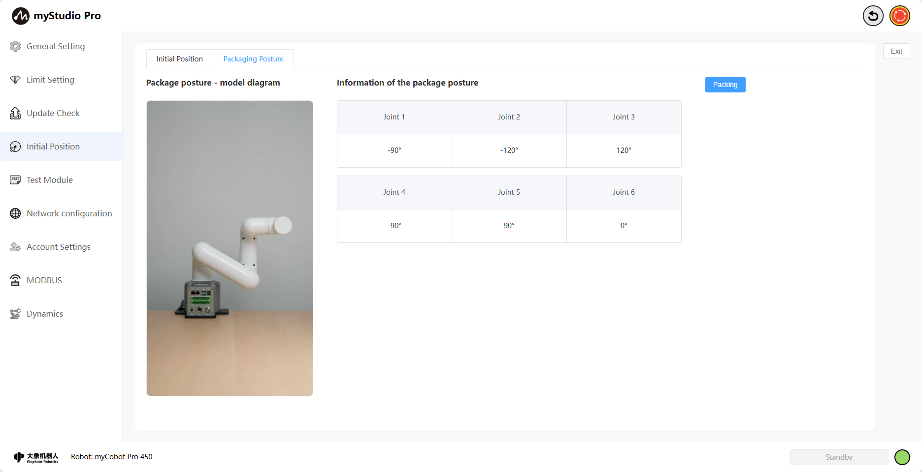 Packaging Attitude Page: Displays the robot arm's packaging attitude model, joint angle information, and a packaging button. This button is a function button; clicking it will move the robot arm to the packaging attitude.