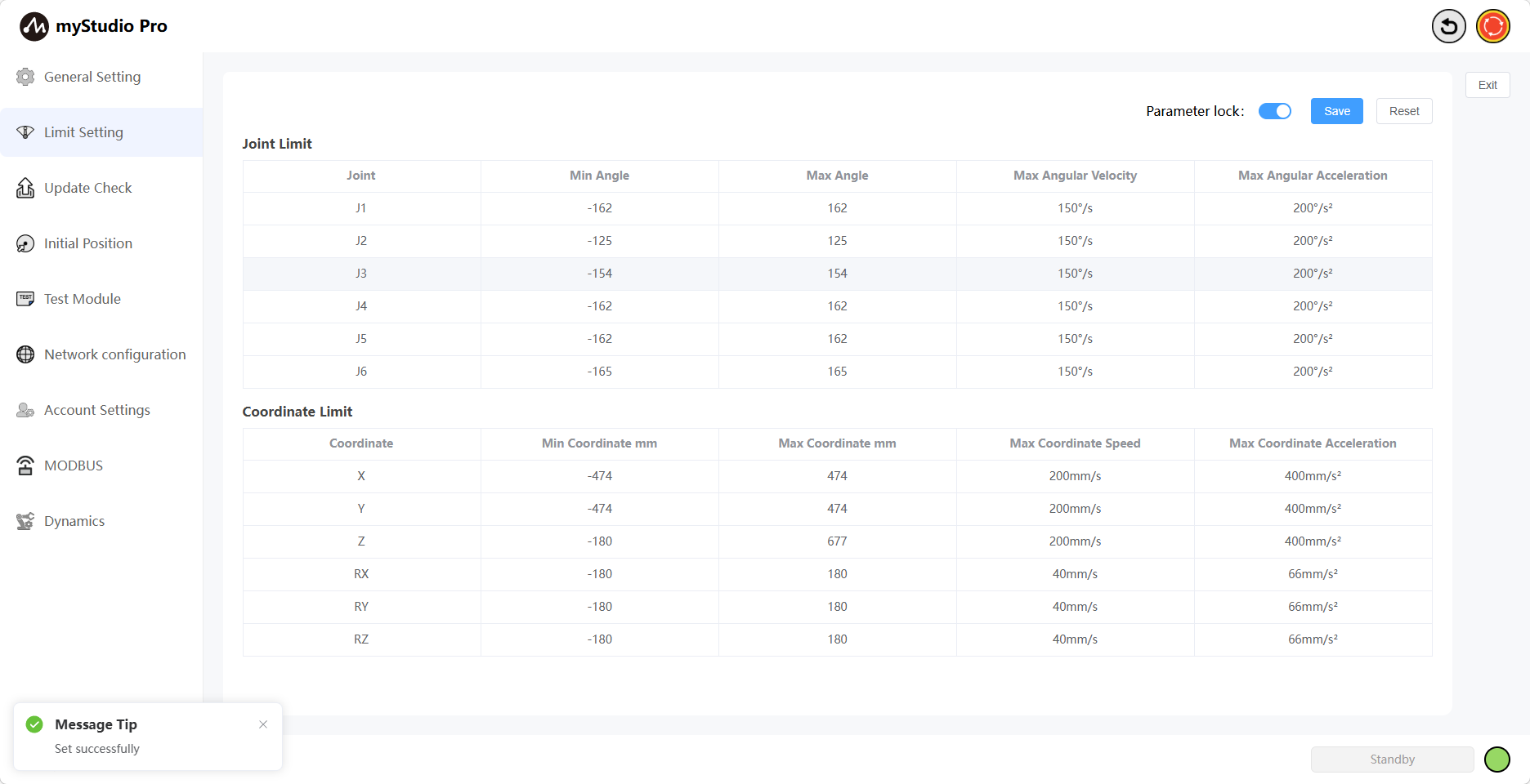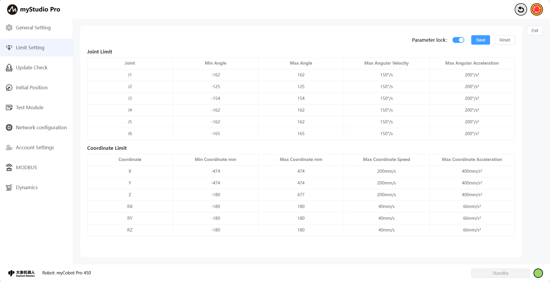 Clicking the Limit Setting icon button will take you to the joint limit settings page. The Limit Setting interface displays the relevant parameters for the current robotic arm's joint limits and coordinate limits by default.