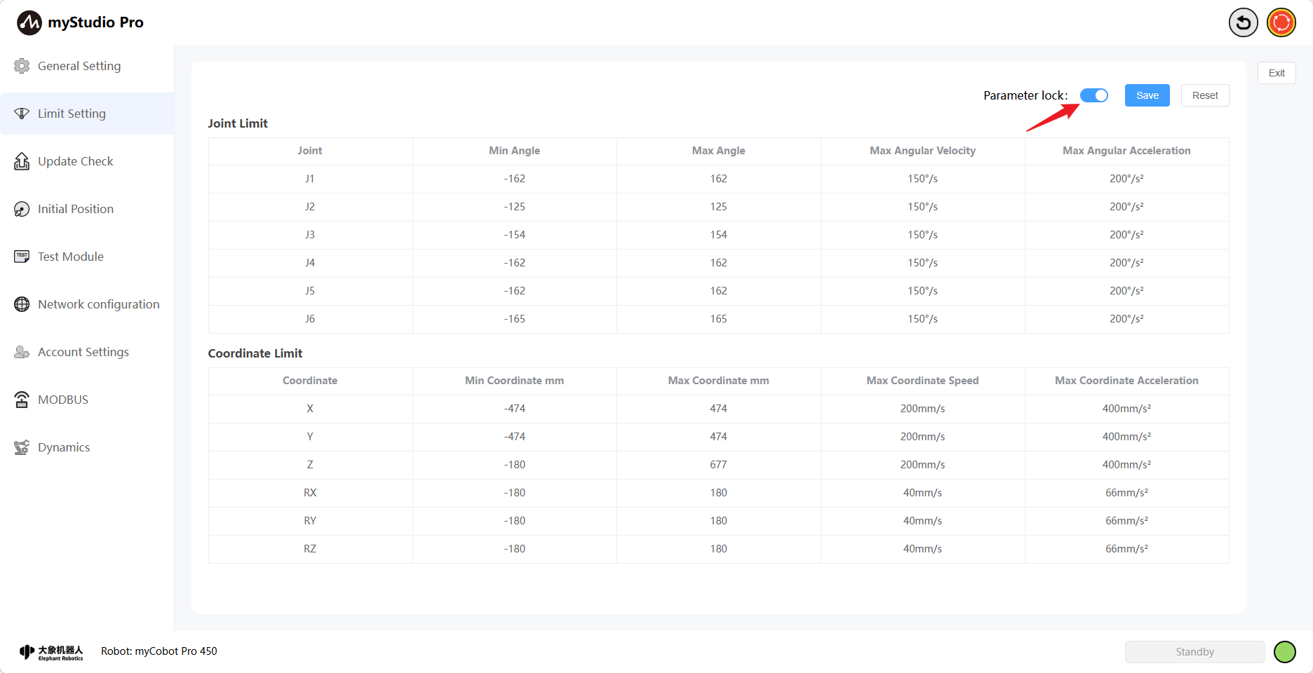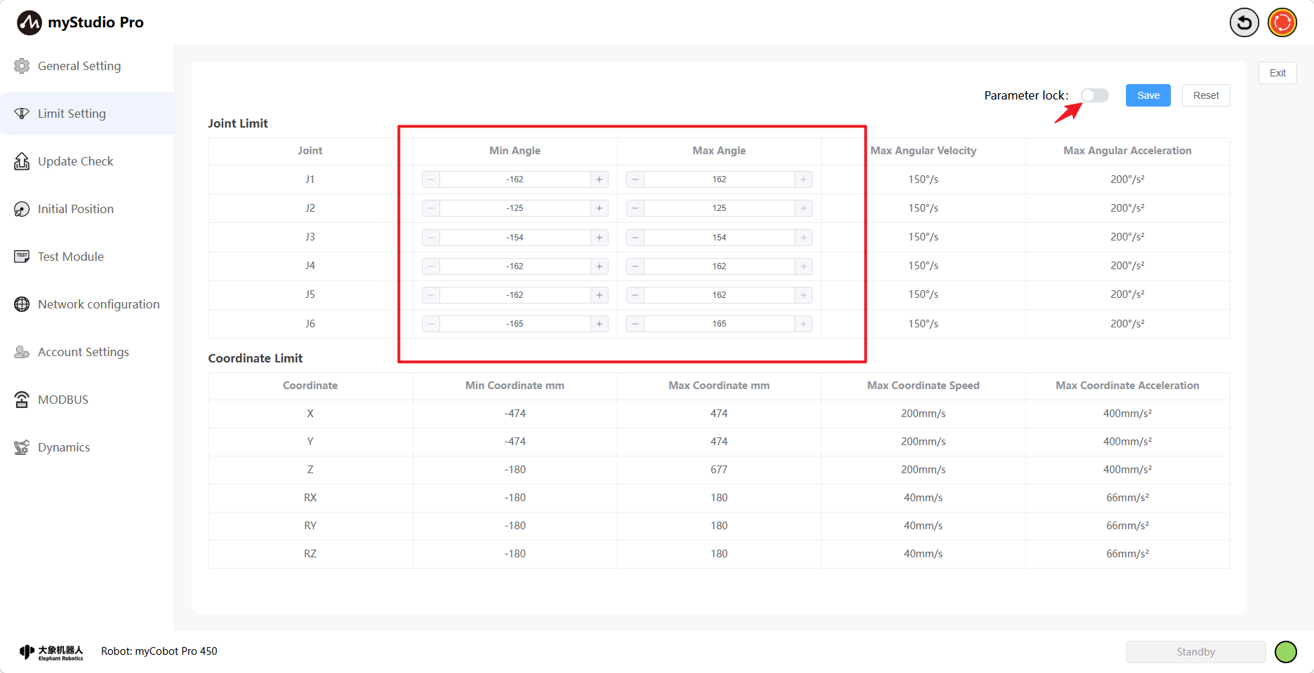When the parameter is locked, clicking the Parameter Lock button will turn the button gray, indicating that it is unlocked and the limit parameters can be modified (only the minimum and maximum angle values can be changed).