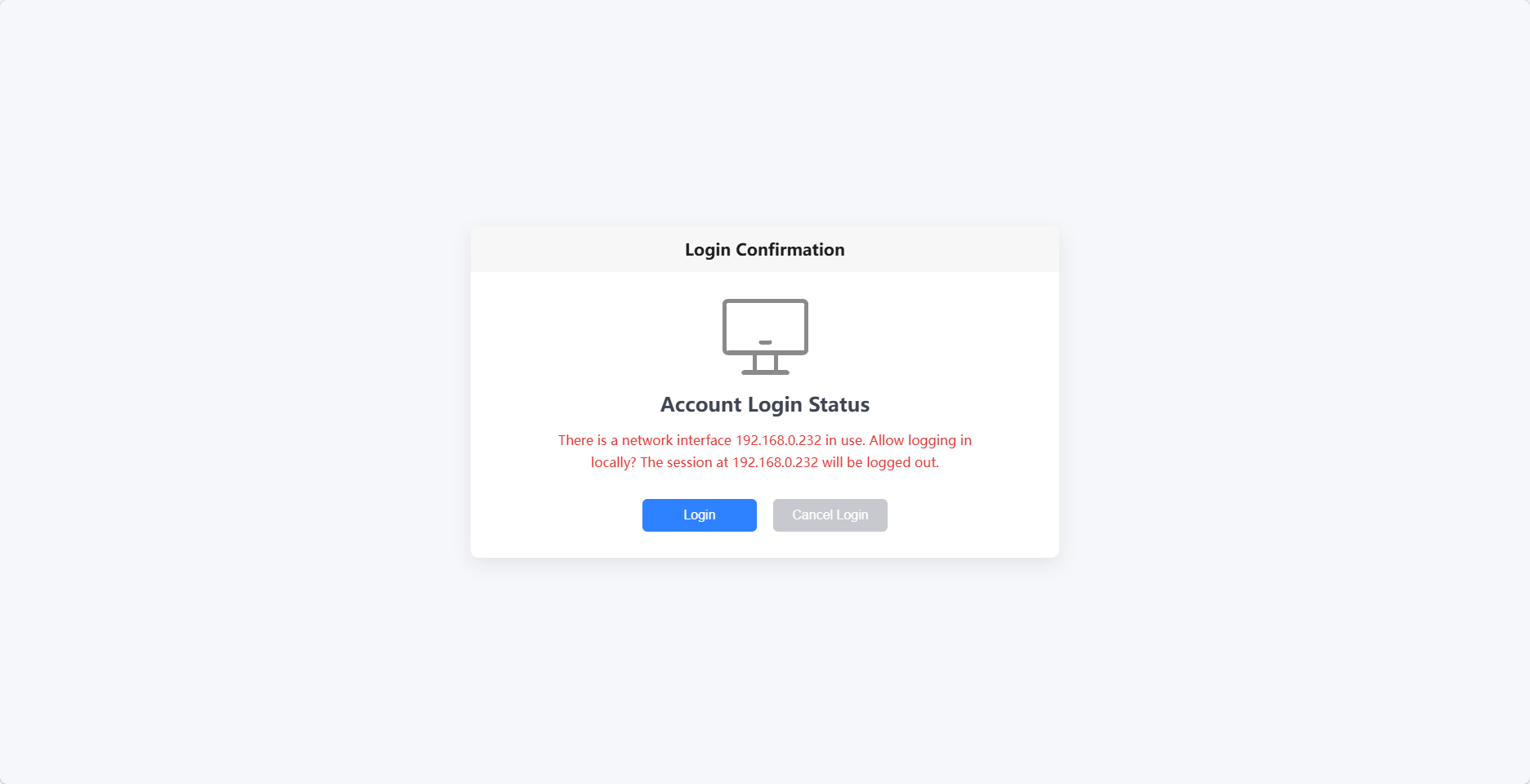 After successful login, the system will first check if any network port is currently using myStudio Pro. If so, a second login confirmation will be required. Clicking "Confirm" will automatically log the currently used network port offline, allowing you to use myStudio Pro normally. Clicking "Cancel" will return you to the login page. Otherwise, you will directly enter the myStudio Pro main interface.