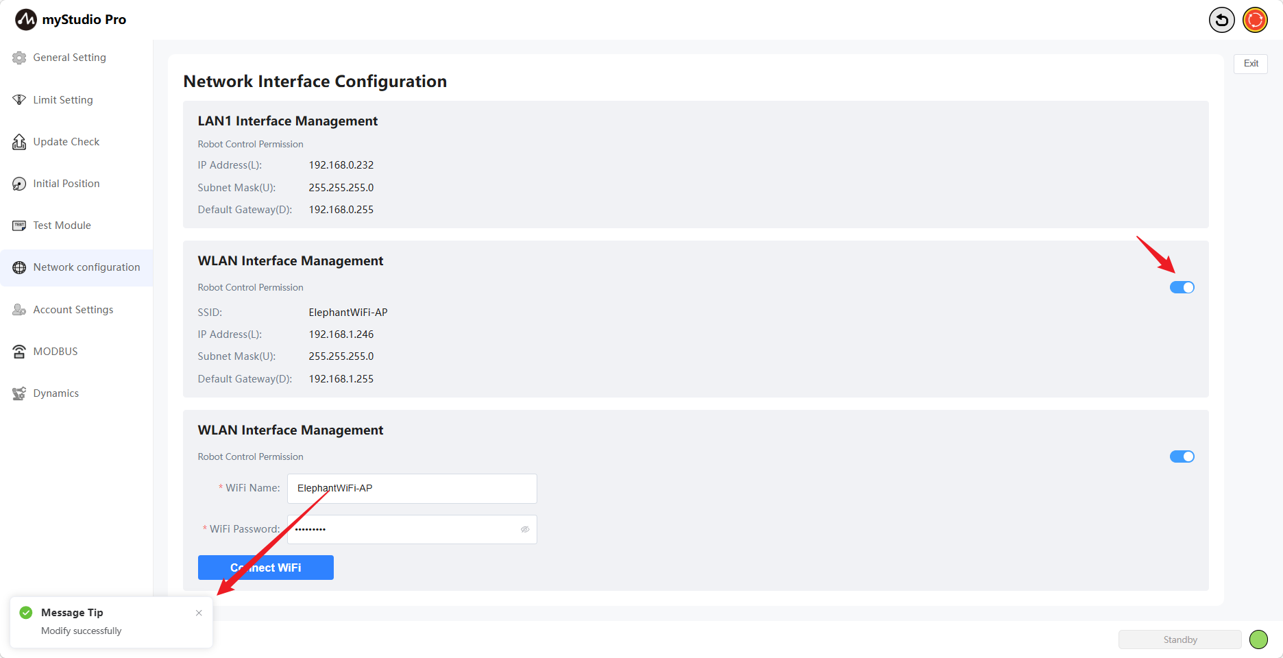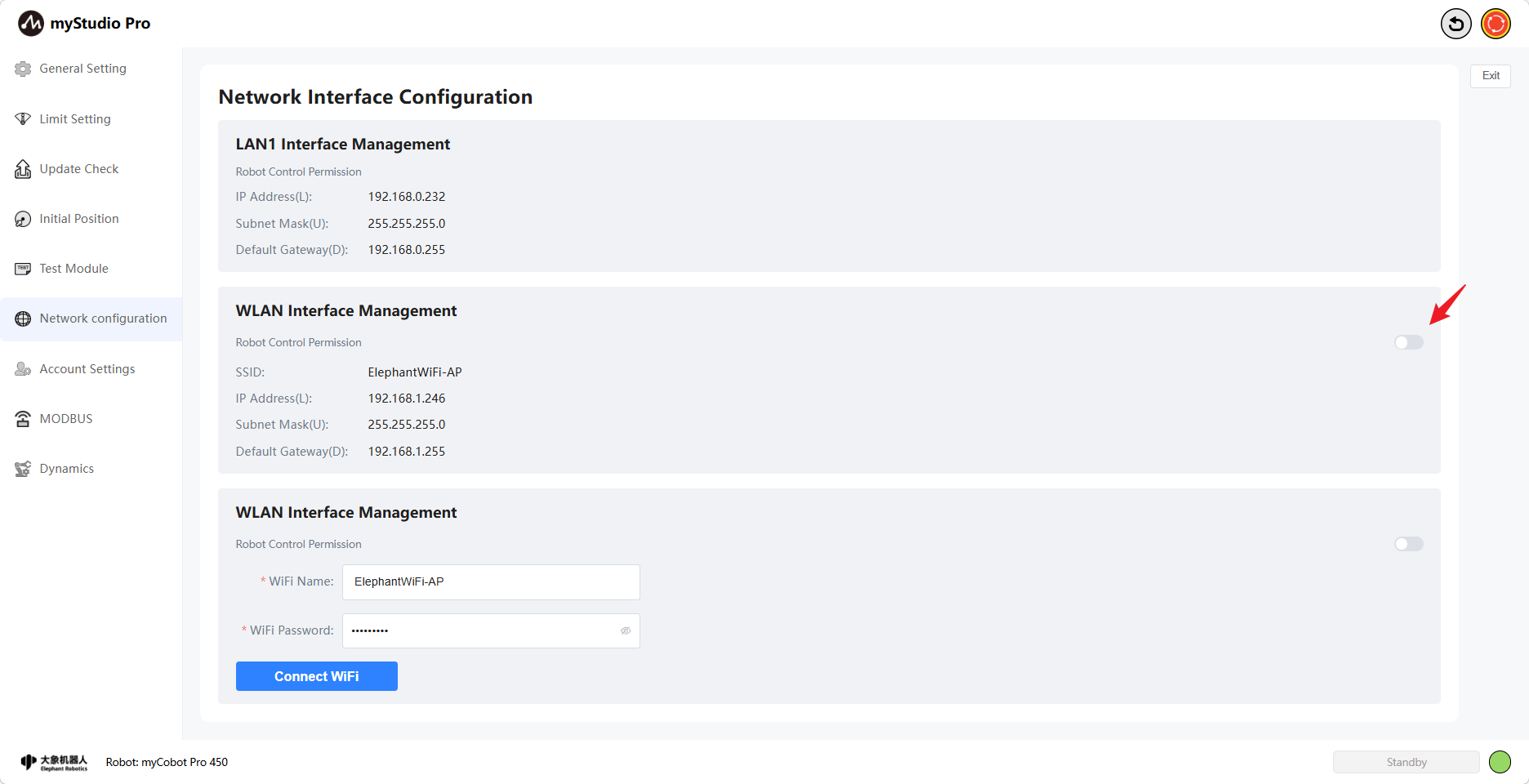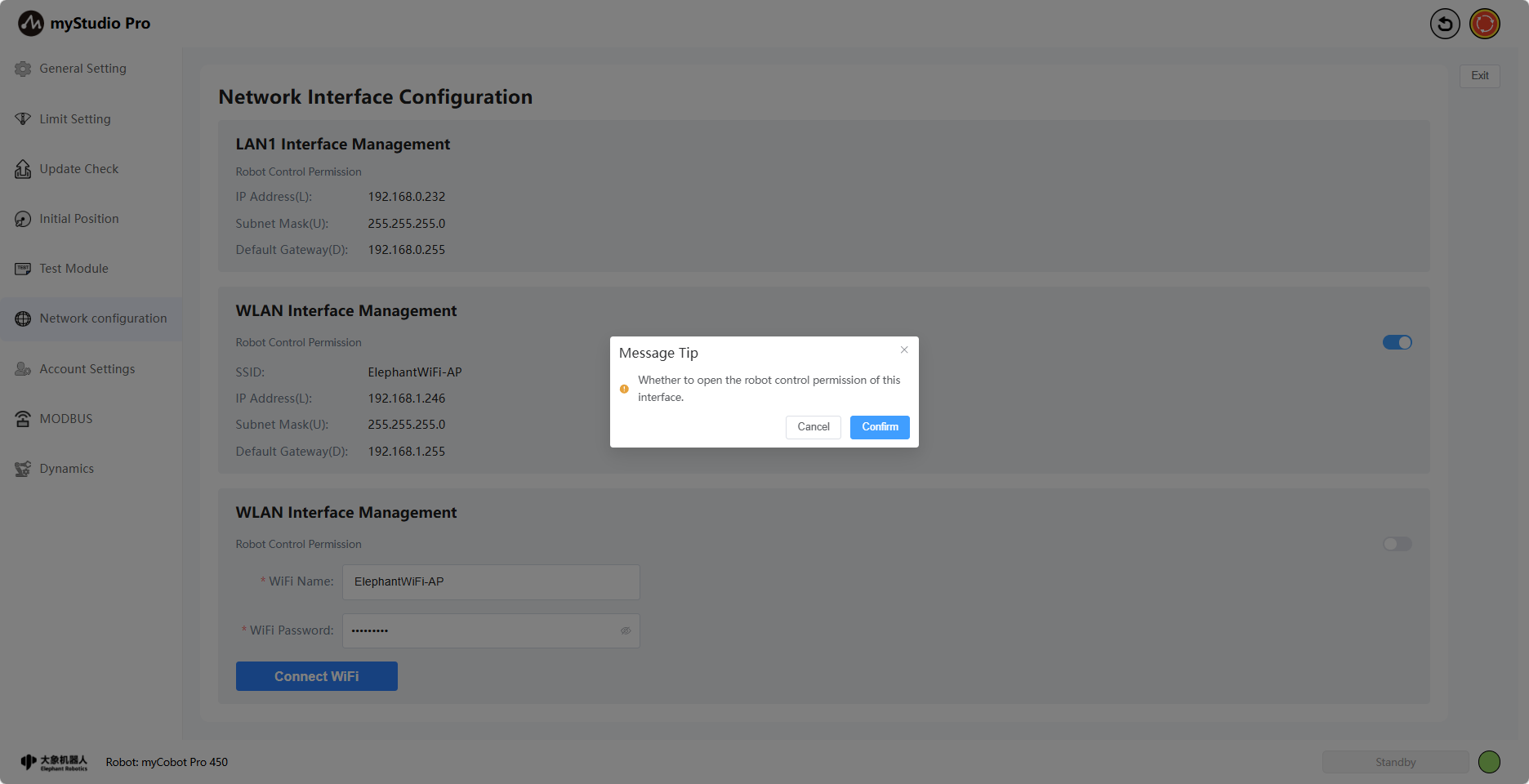 Furthermore, you can modify the robot control permissions for this network port on this page. When robot control permissions are not enabled, accessing myStudio Pro will display a message indicating no control permissions. myStudio Pro can only be used normally when control permissions are enabled.