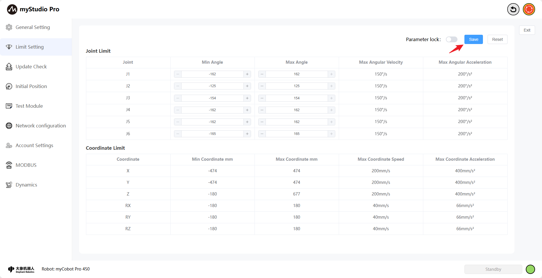 Note: Limit parameter modification only supports the minimum and maximum angles of the joints; other parameters cannot be modified.