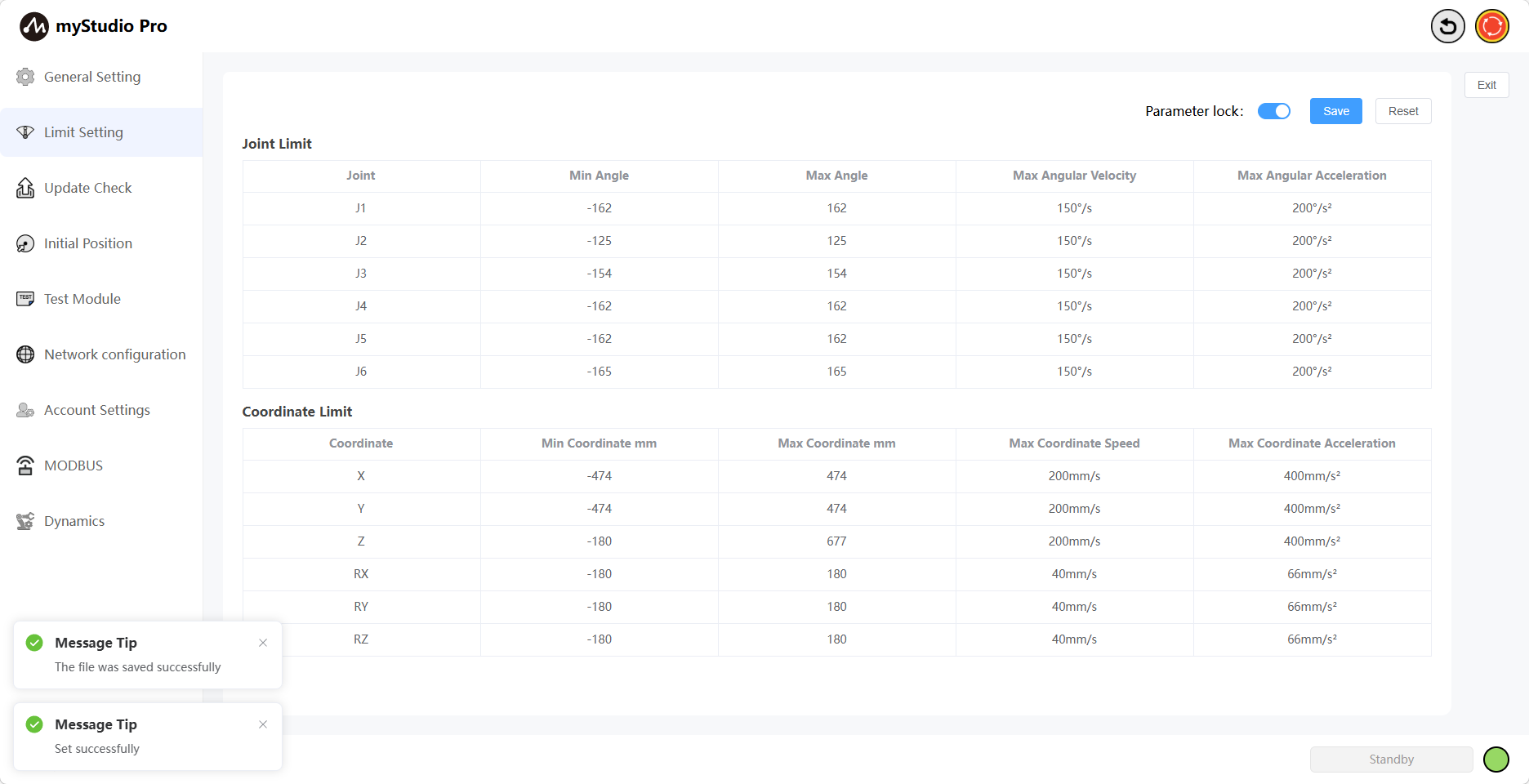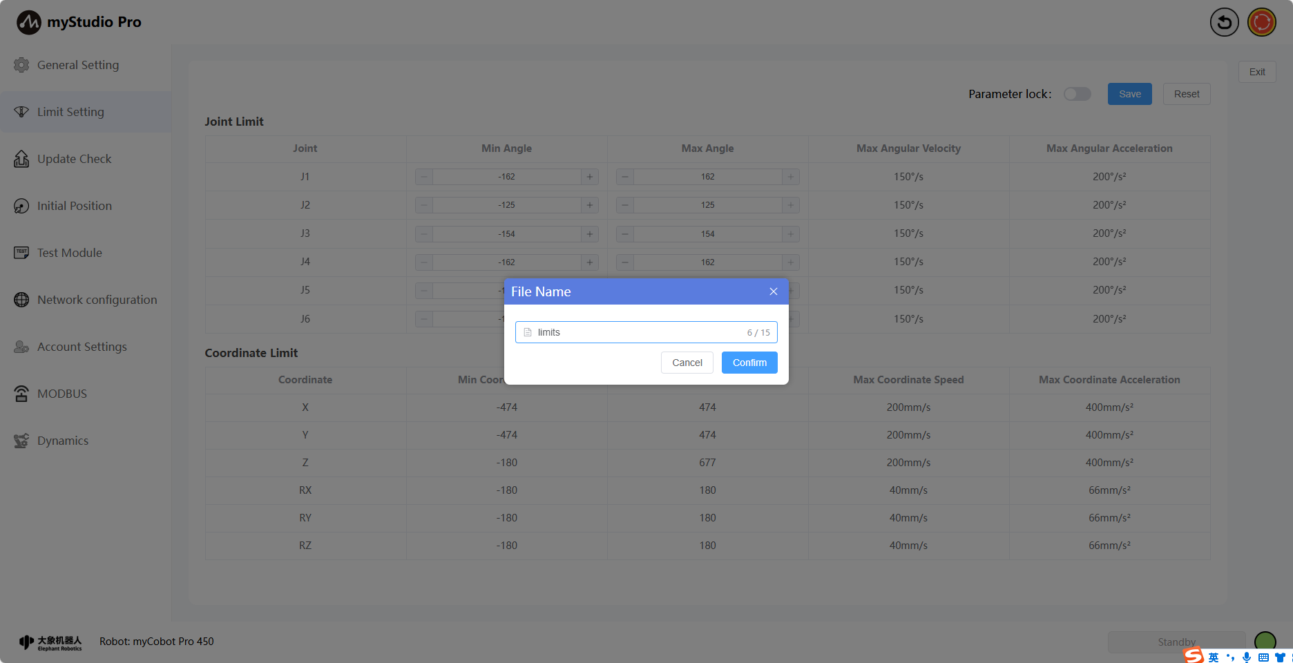 Click the Save button, and define the filename according to the prompts in the pop-up window. This will save the parameters of the current limit setting page to a local file (JSON file) and set the joint limits of the robotic arm. A message will be displayed on the page after successful setting.