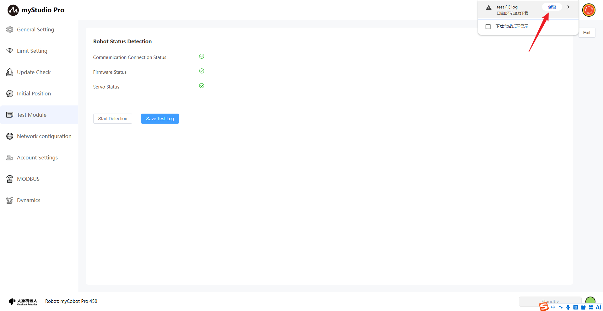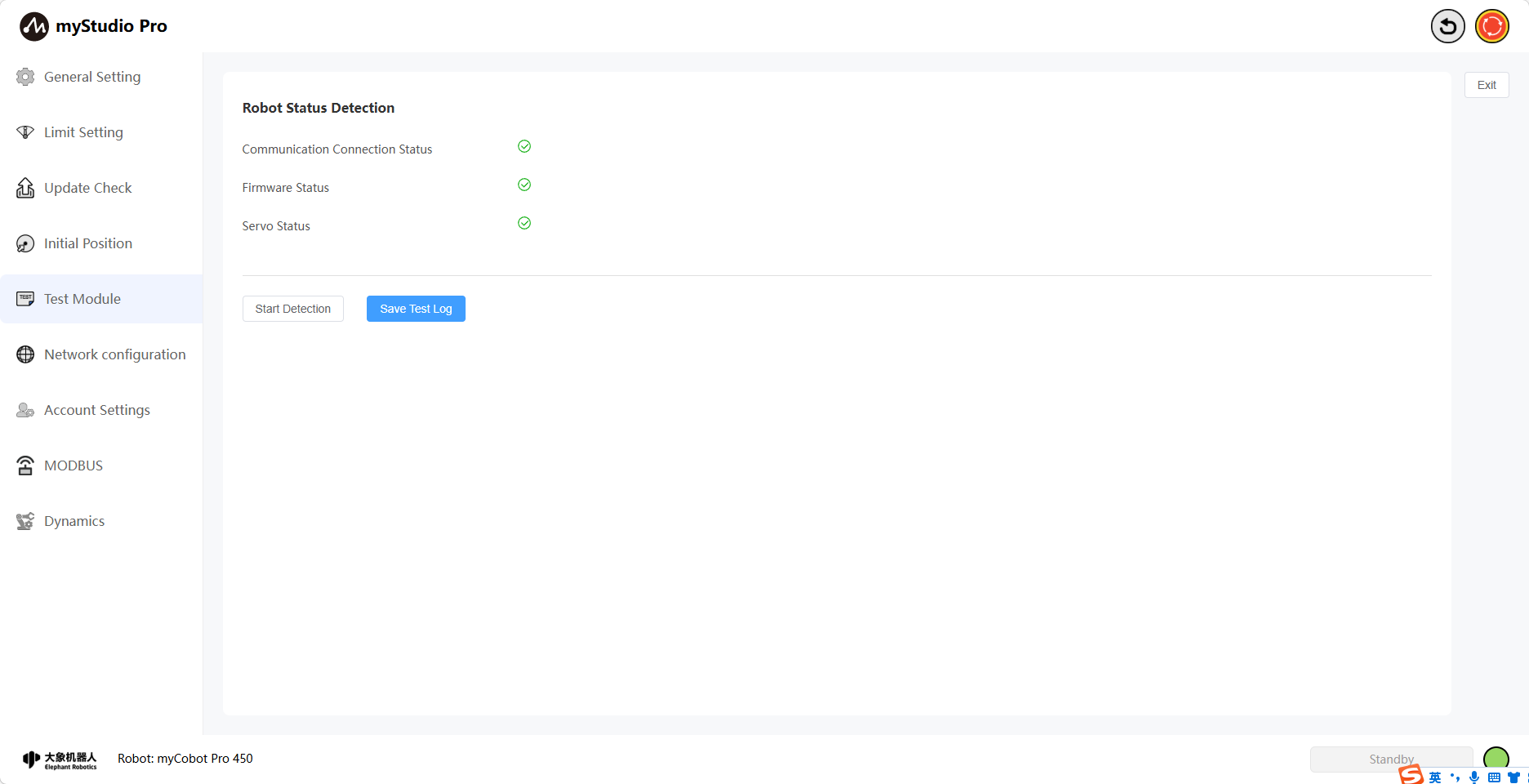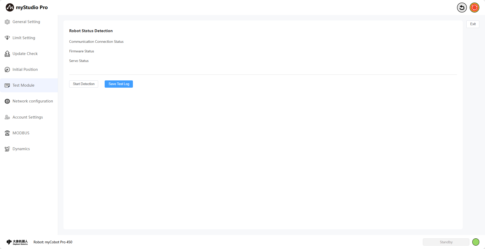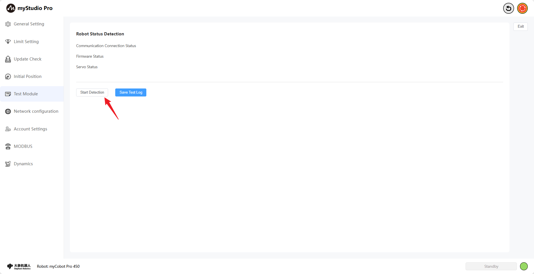 The Test page primarily tests the robot arm's communication connection, firmware version, servo motor status, etc.