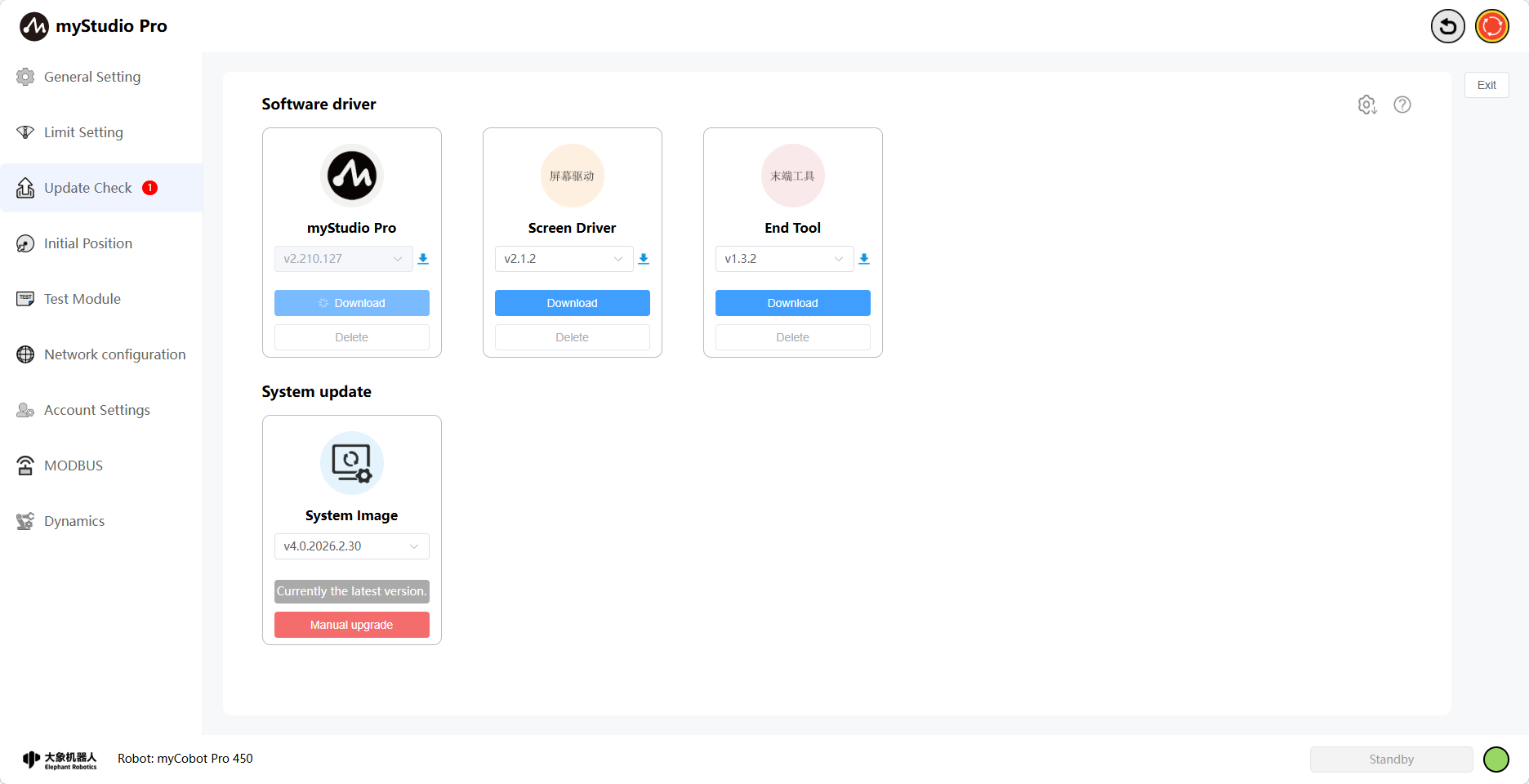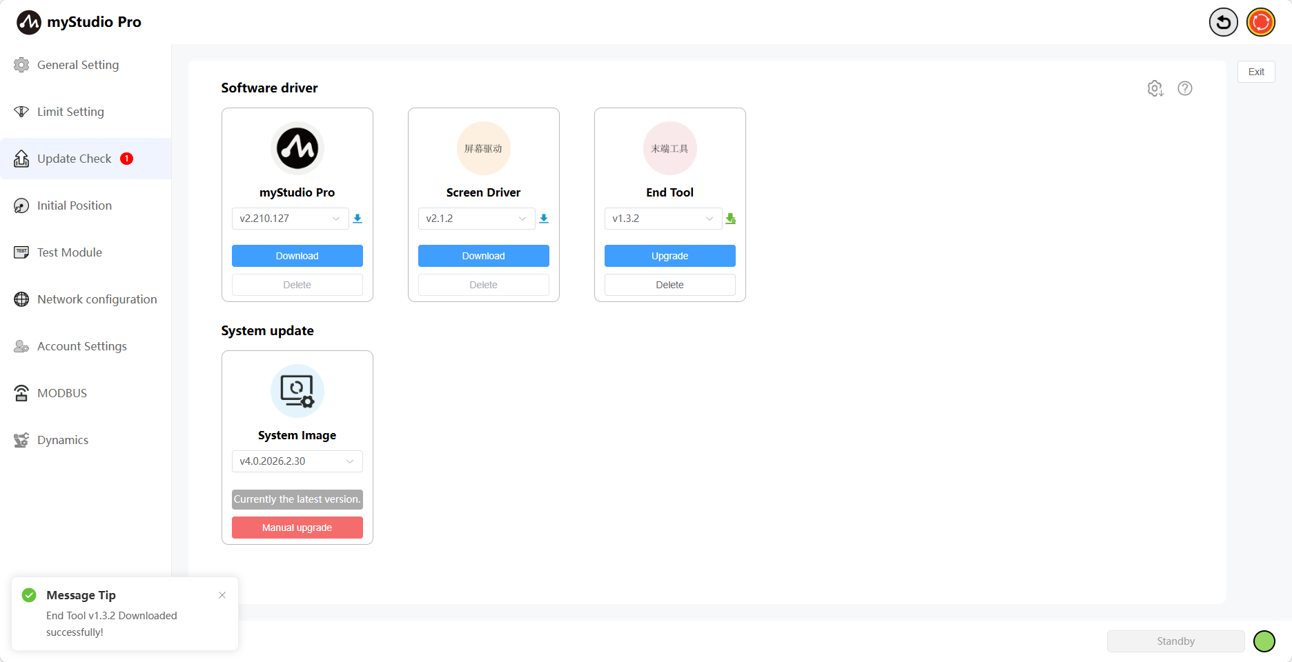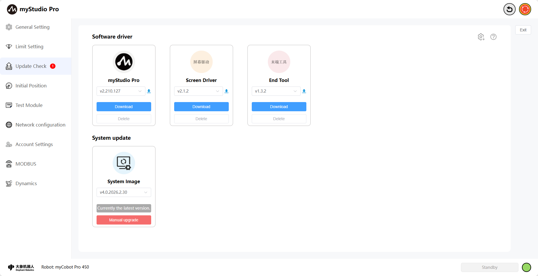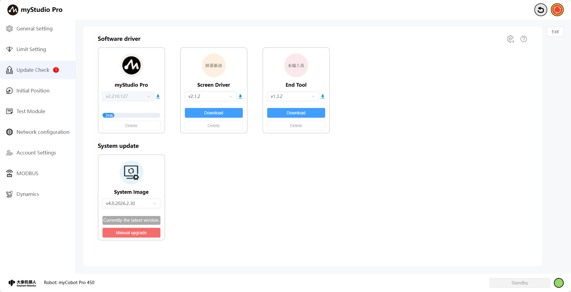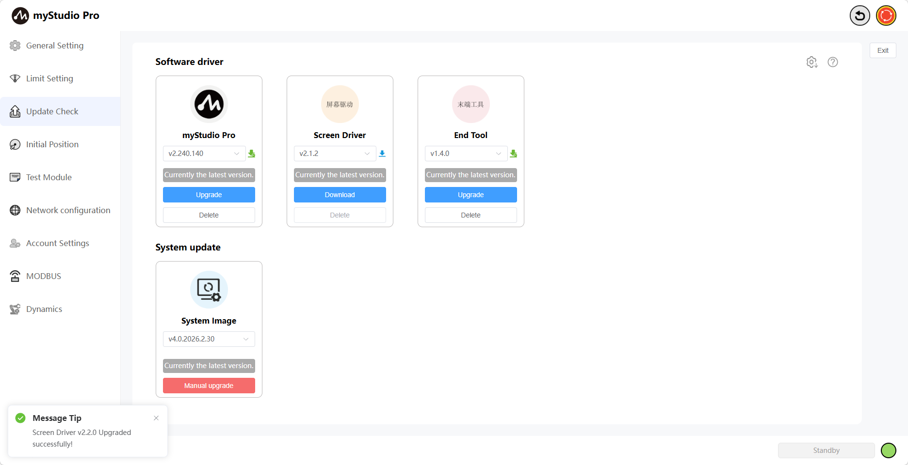 Clicking the Check for Updates icon will take you to the update status page. This page allows you to download, delete, and upgrade software drivers (myStudio Pro, screen driver, terminal tools), and download and manually upgrade system images.