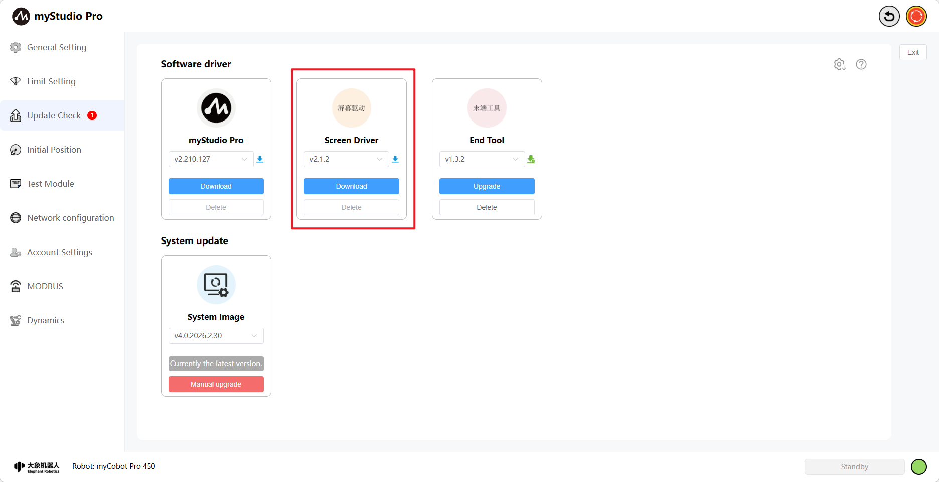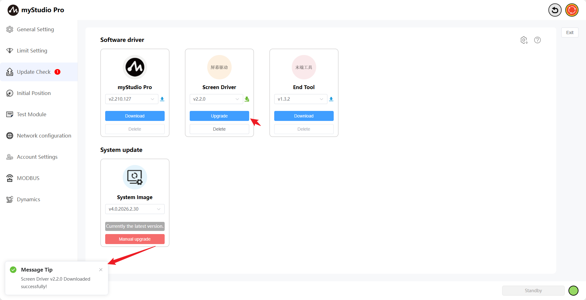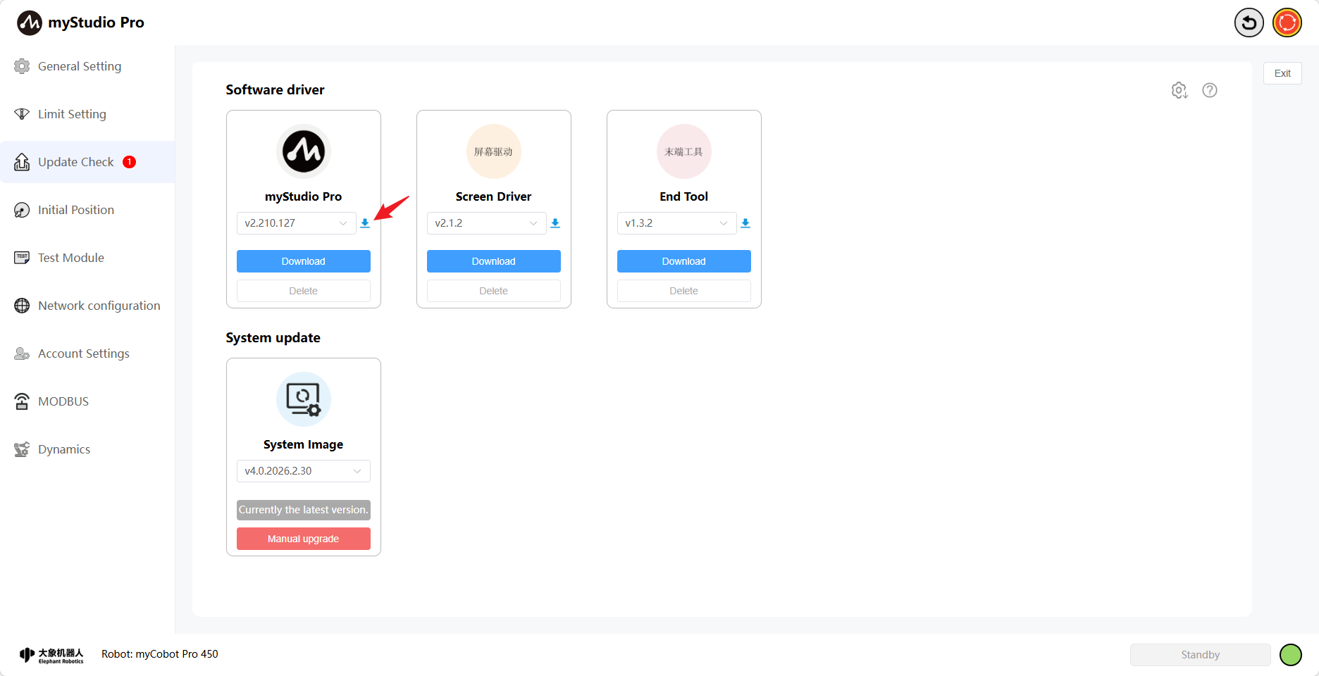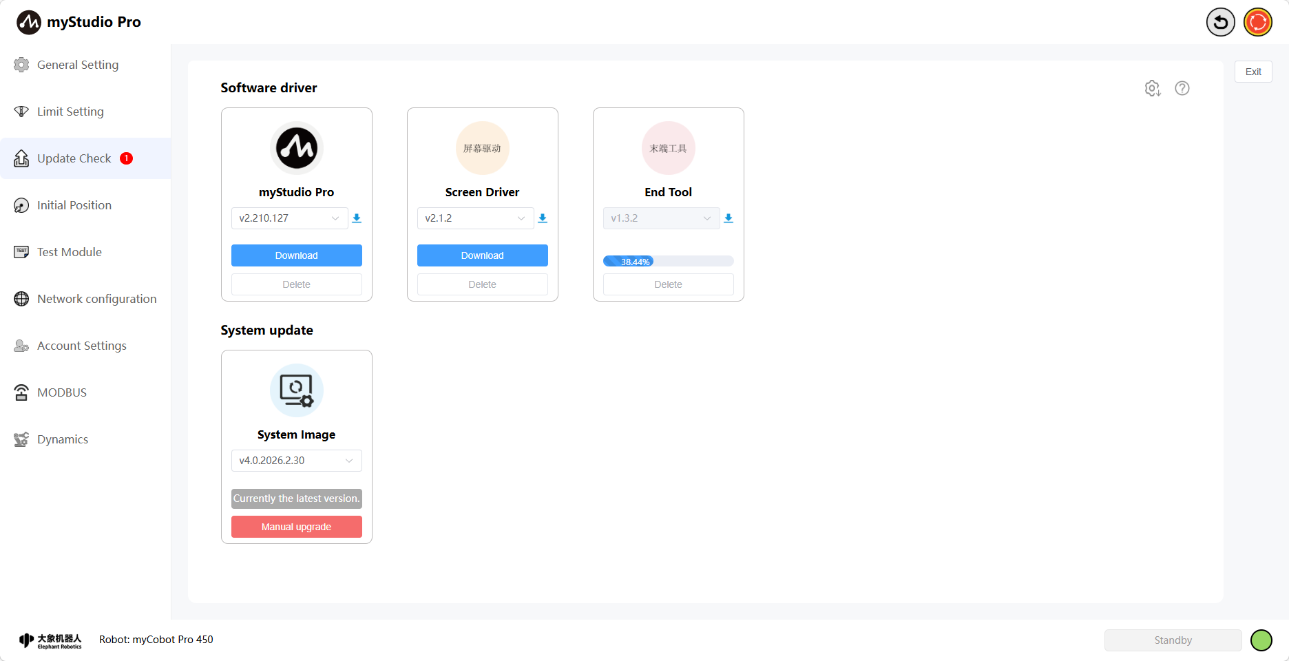 Clicking the Check for Updates icon will take you to the update status page. This page allows you to download, delete, and upgrade software drivers (myStudio Pro, screen driver, terminal tools), and download and manually upgrade system images.