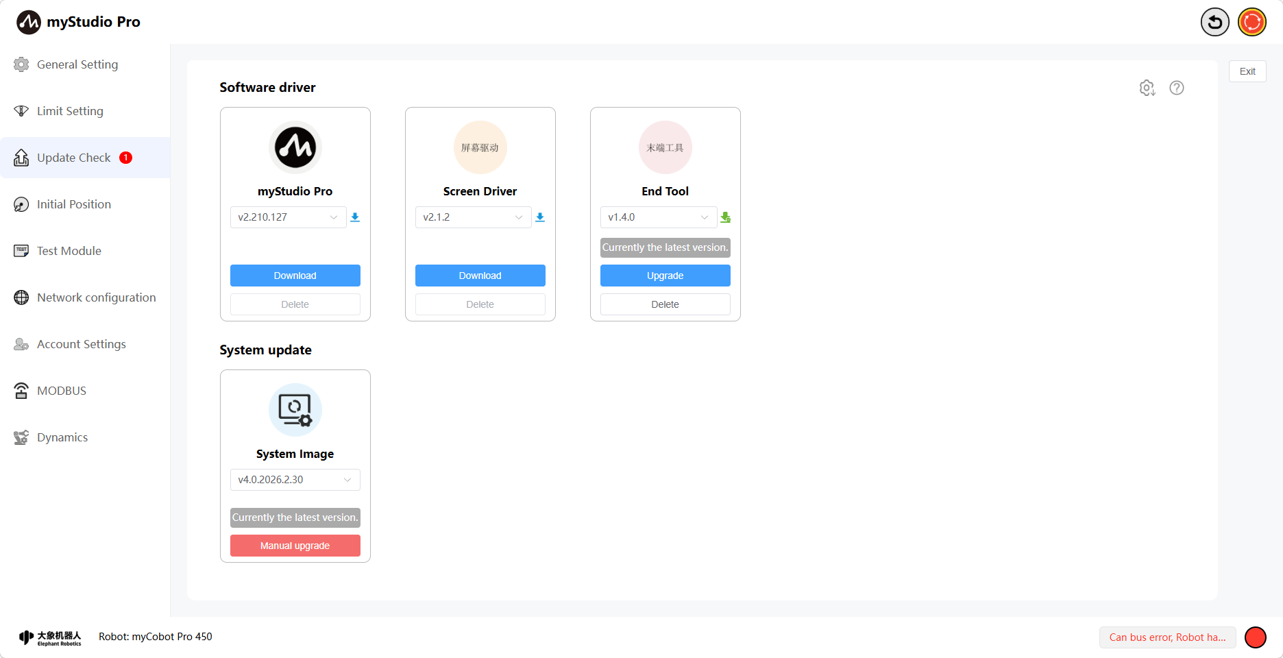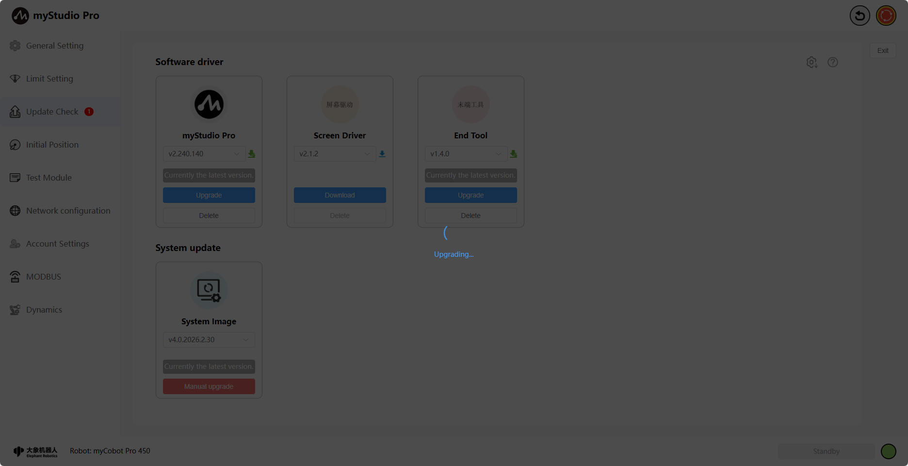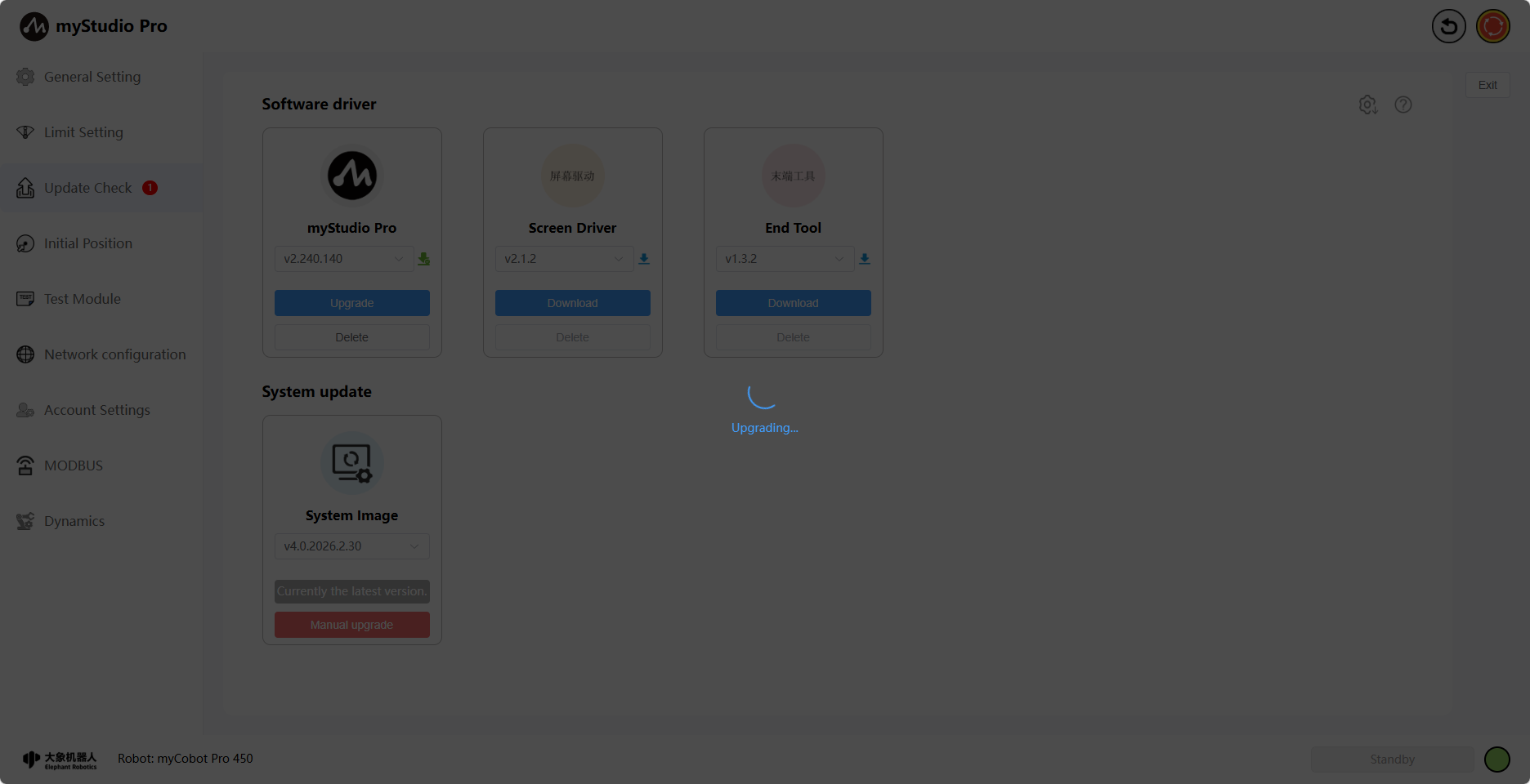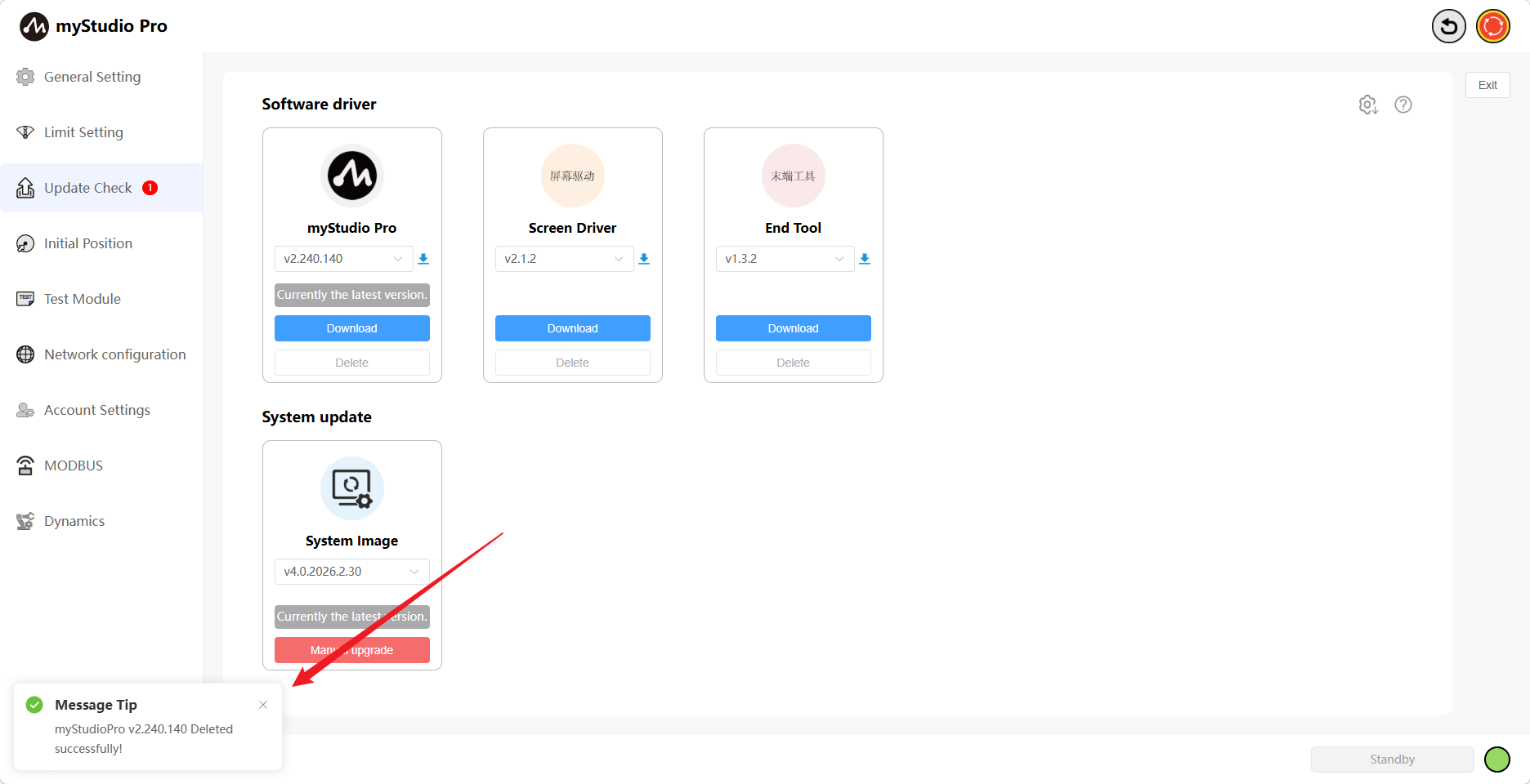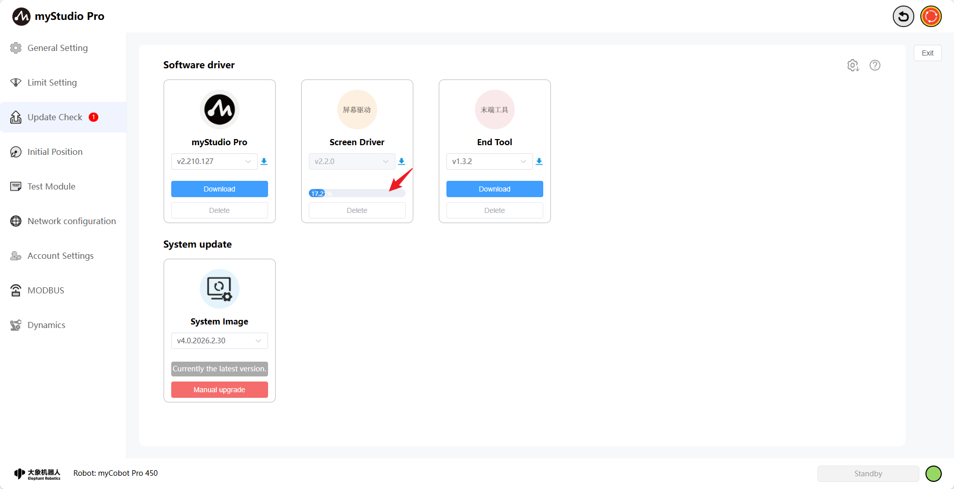 Clicking the Check for Updates icon will take you to the update status page. This page allows you to download, delete, and upgrade software drivers (myStudio Pro, screen driver, terminal tools), and download and manually upgrade system images.