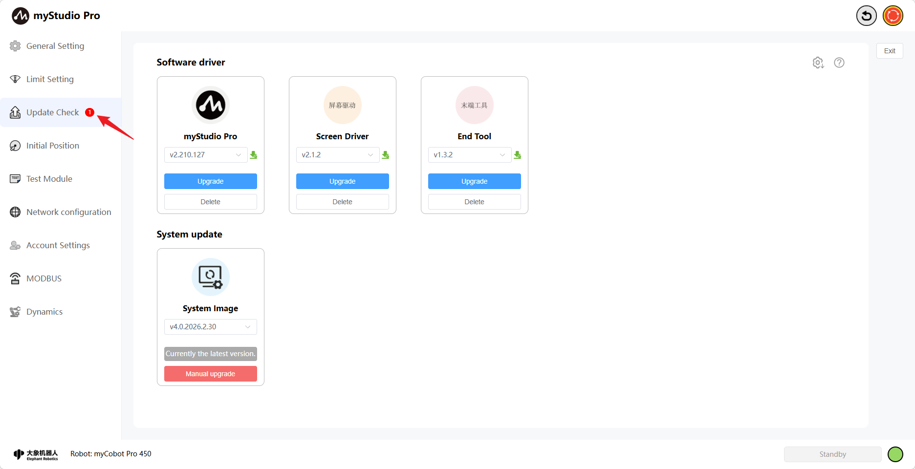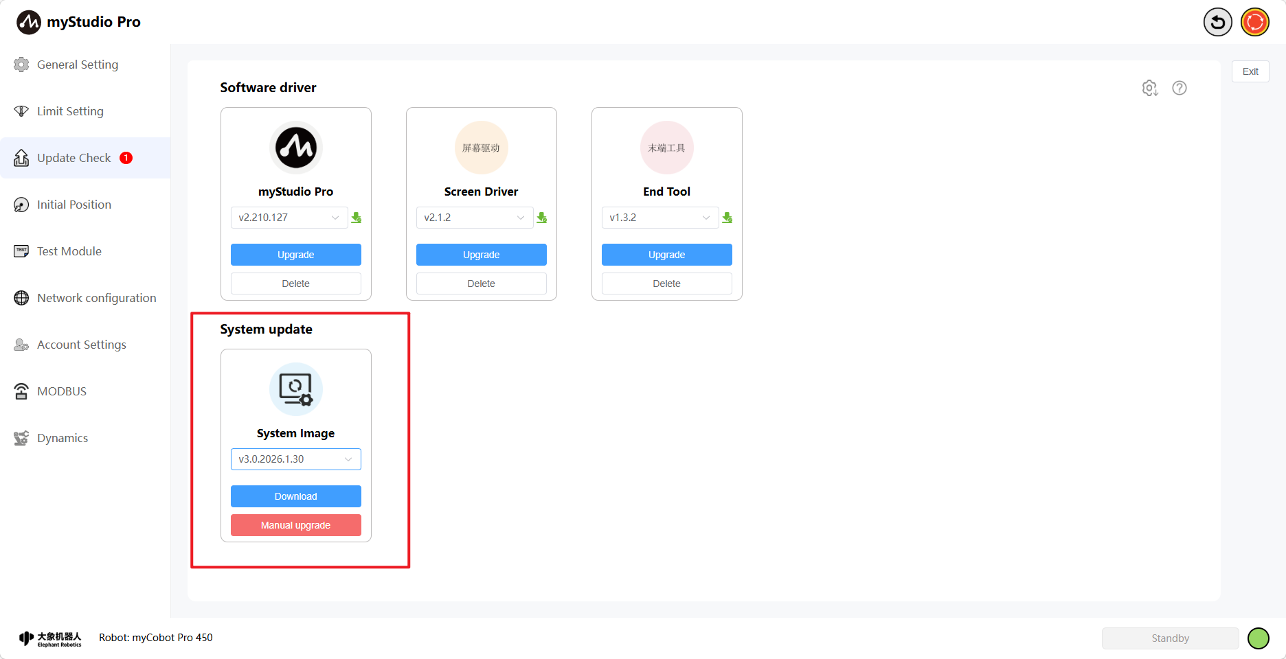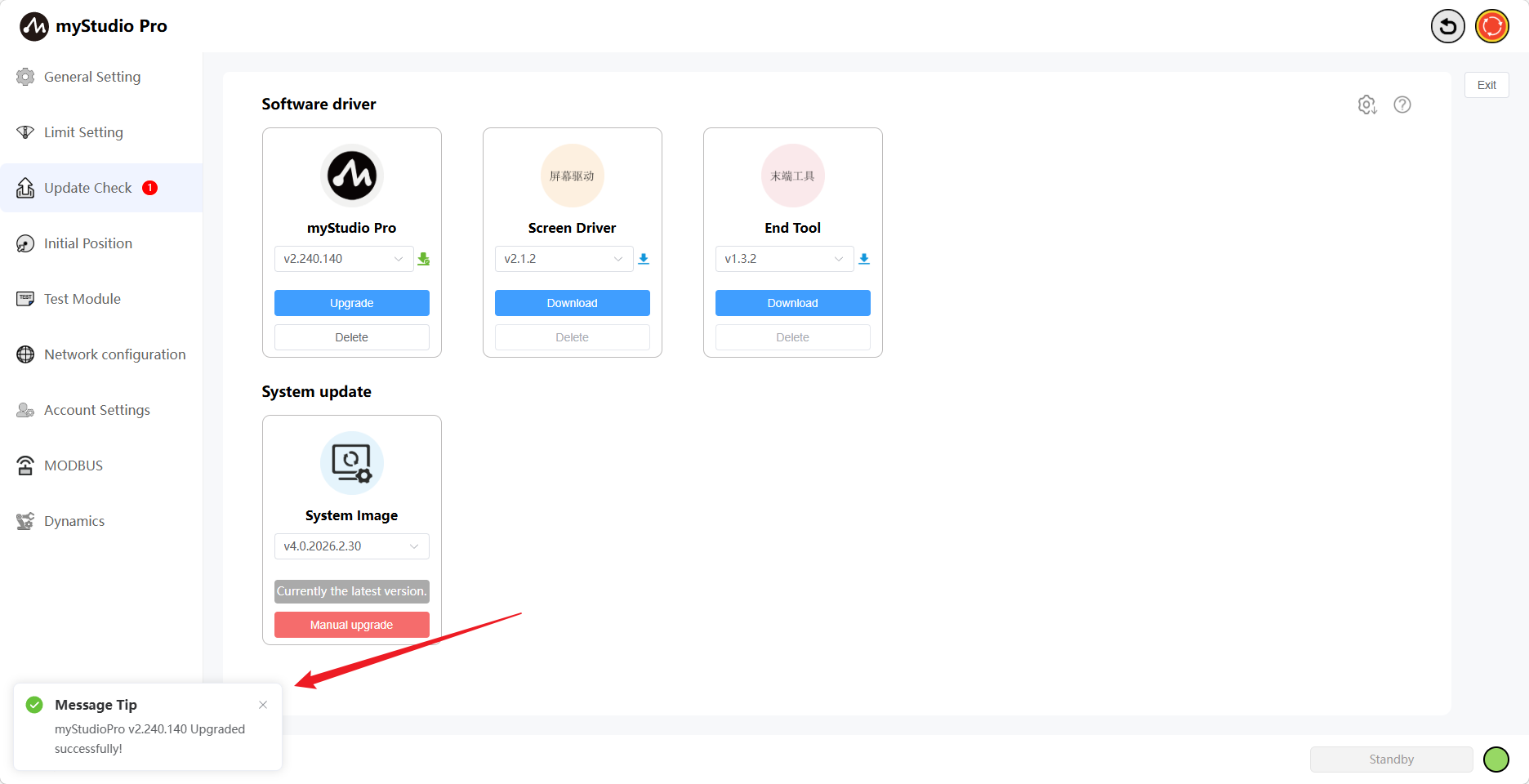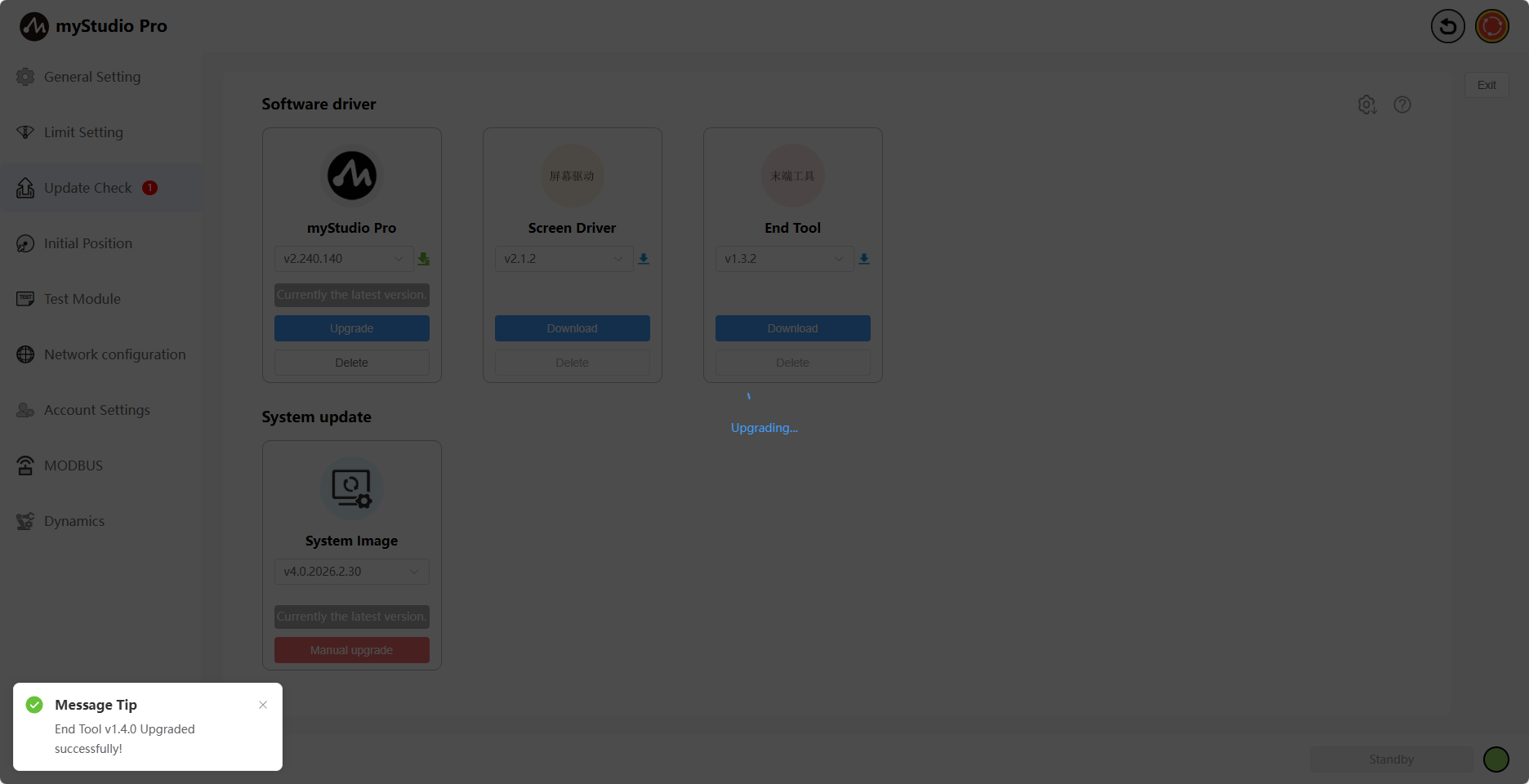 Clicking the Check for Updates icon will take you to the update status page. This page allows you to download, delete, and upgrade software drivers (myStudio Pro, screen driver, terminal tools), and download and manually upgrade system images.