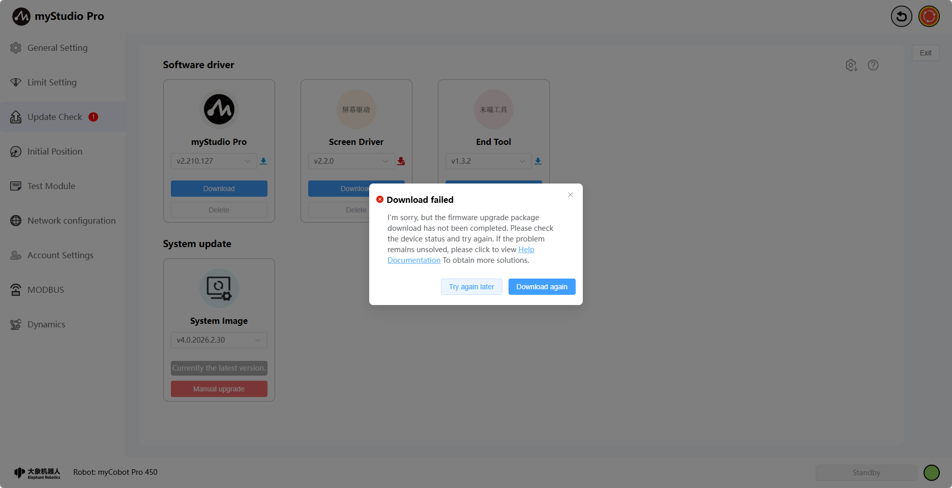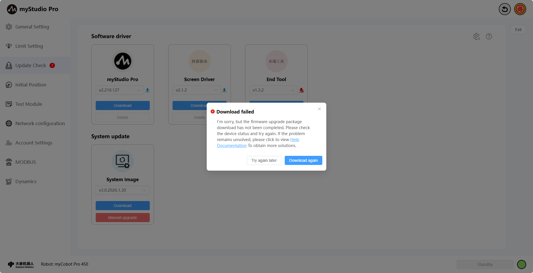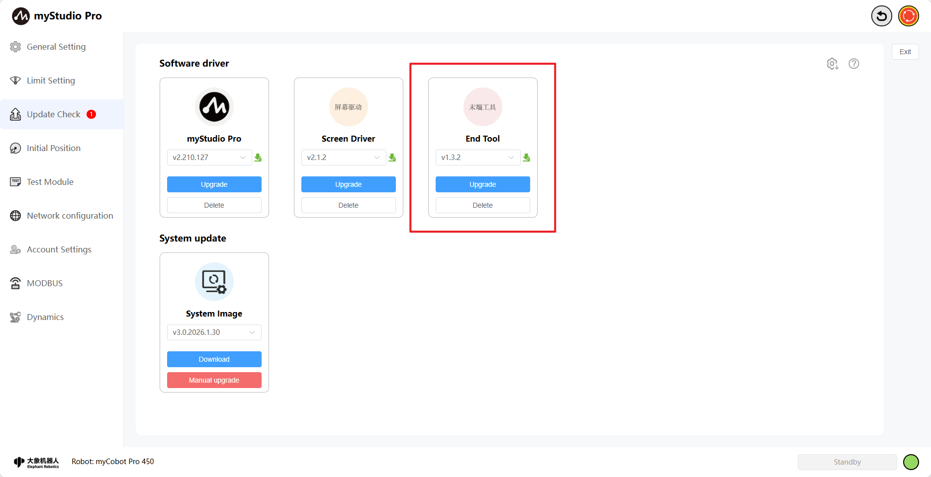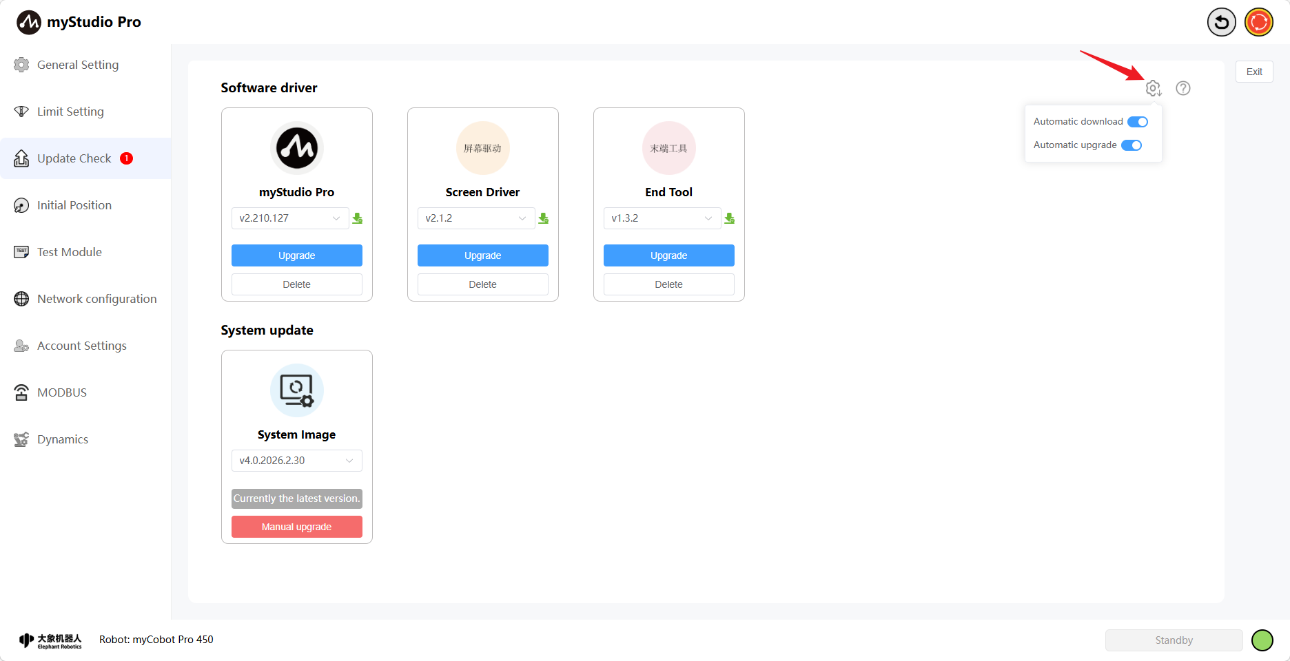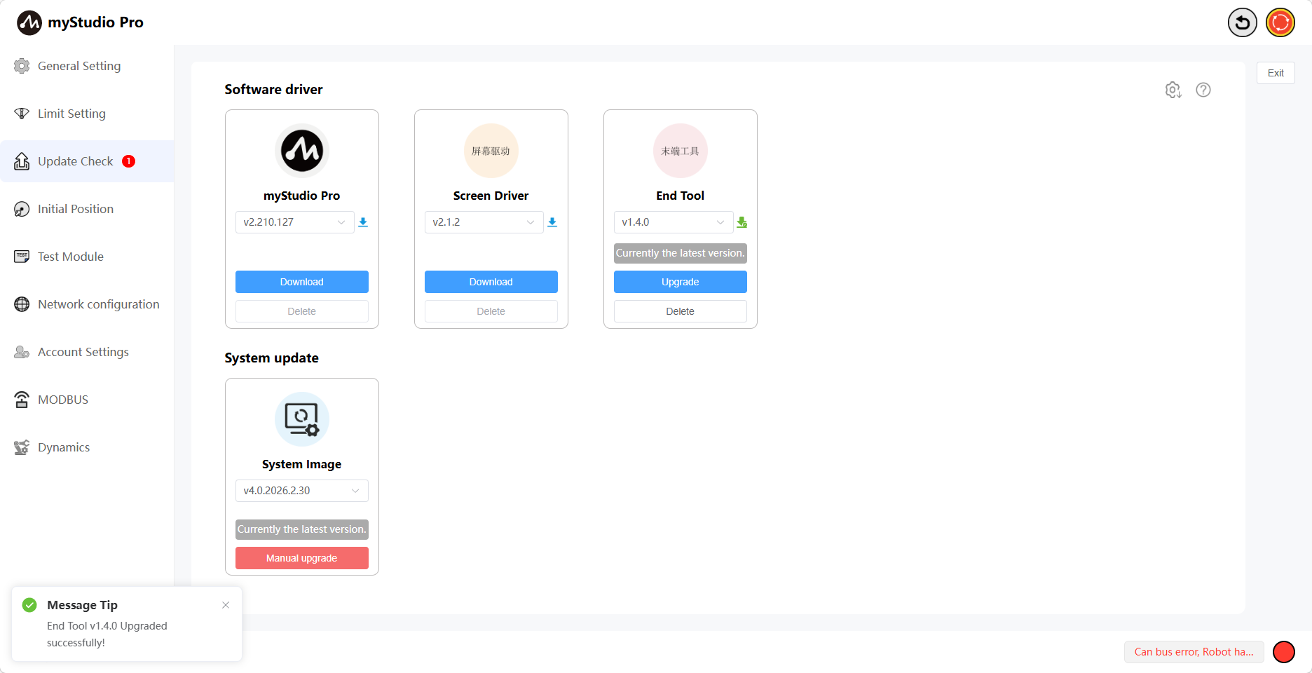 Clicking the Check for Updates icon will take you to the update status page. This page allows you to download, delete, and upgrade software drivers (myStudio Pro, screen driver, terminal tools), and download and manually upgrade system images.