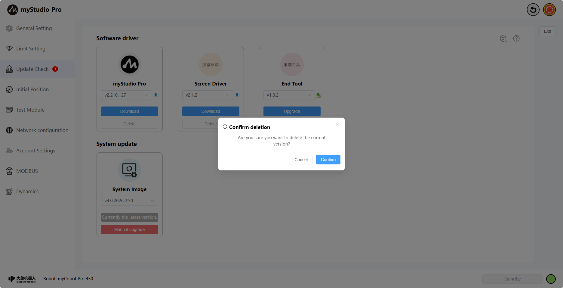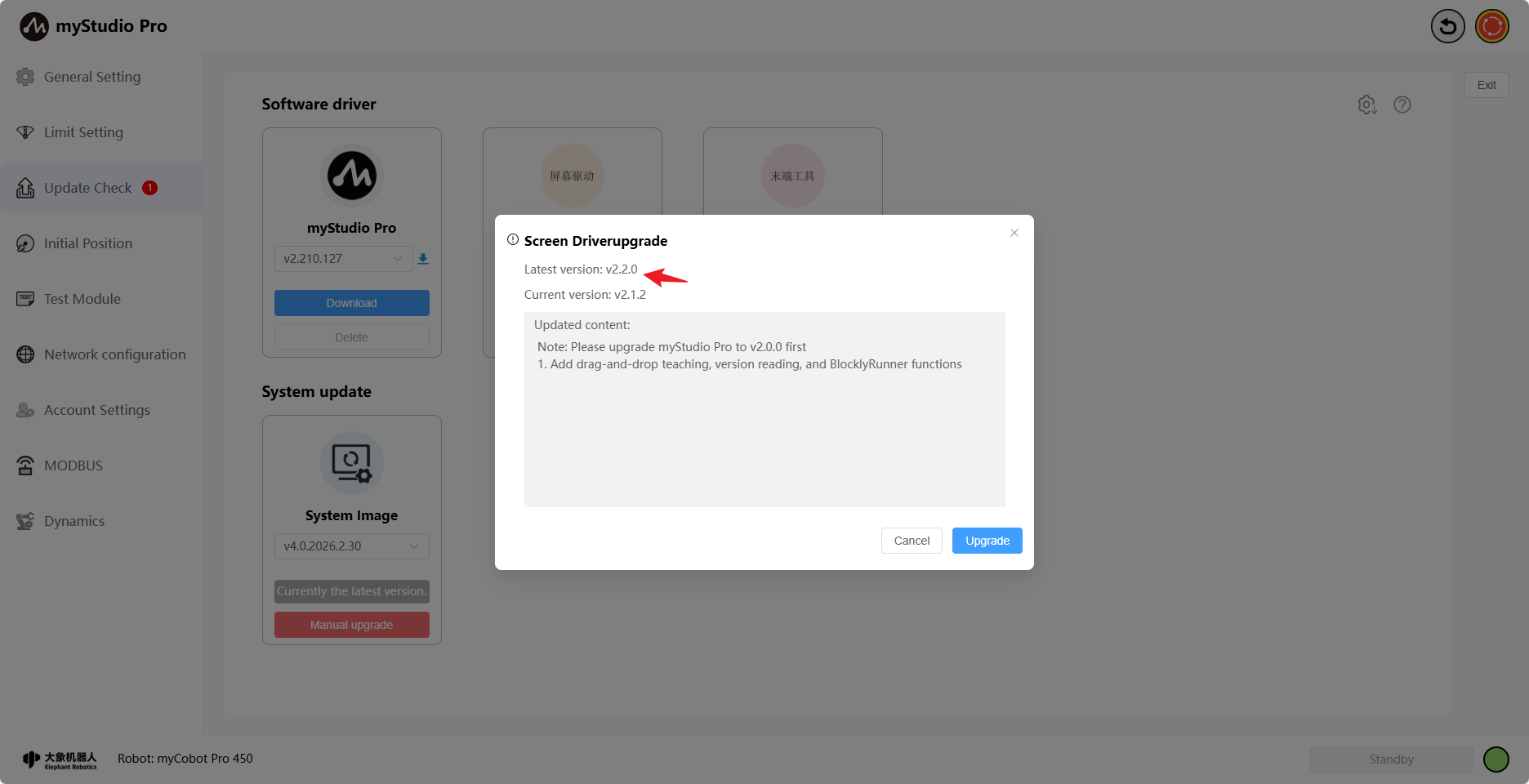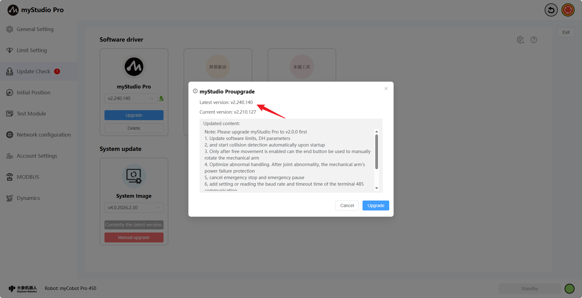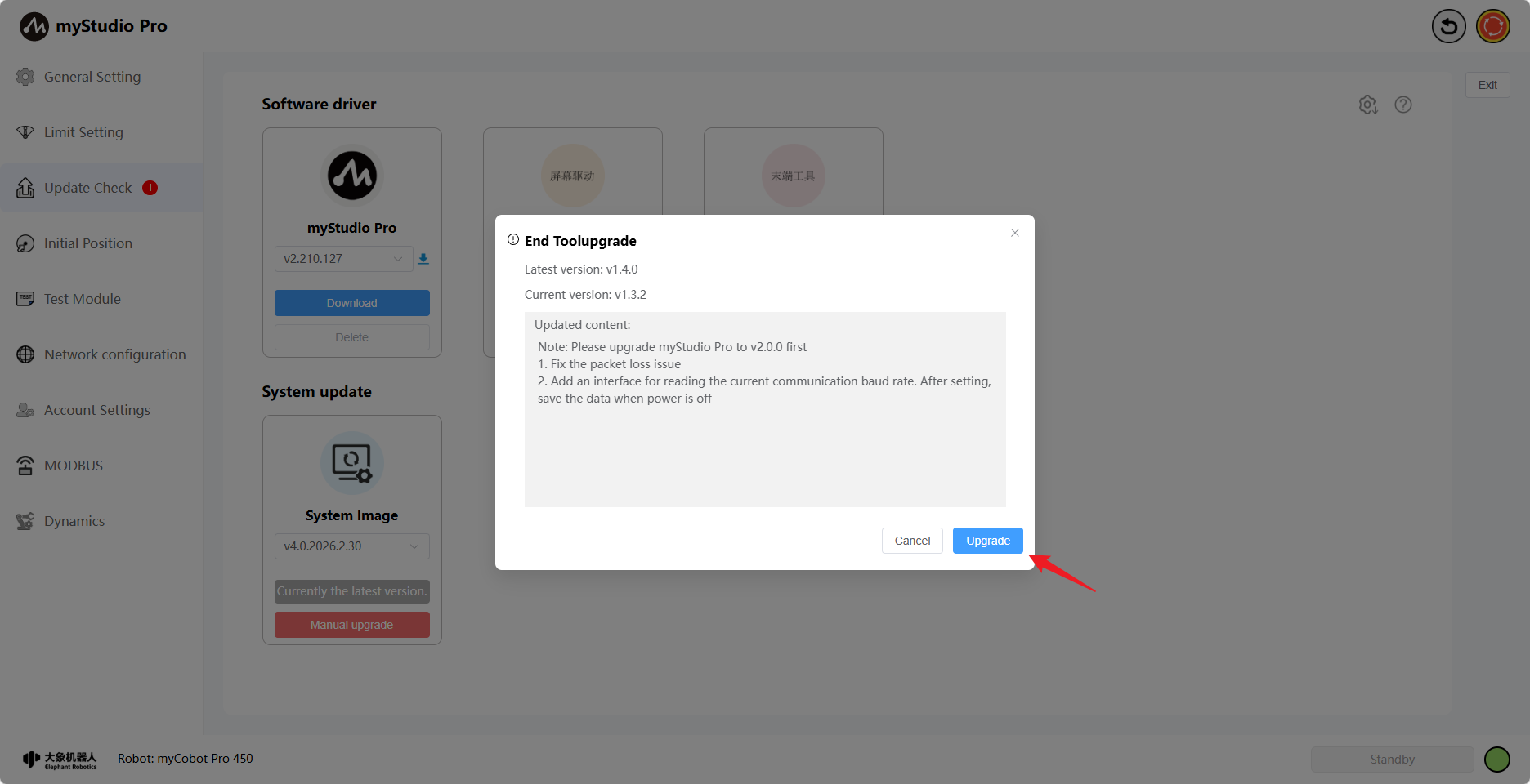 Clicking the Upgrade button will bring up the update details, the current version of the robotic arm, and the latest version.