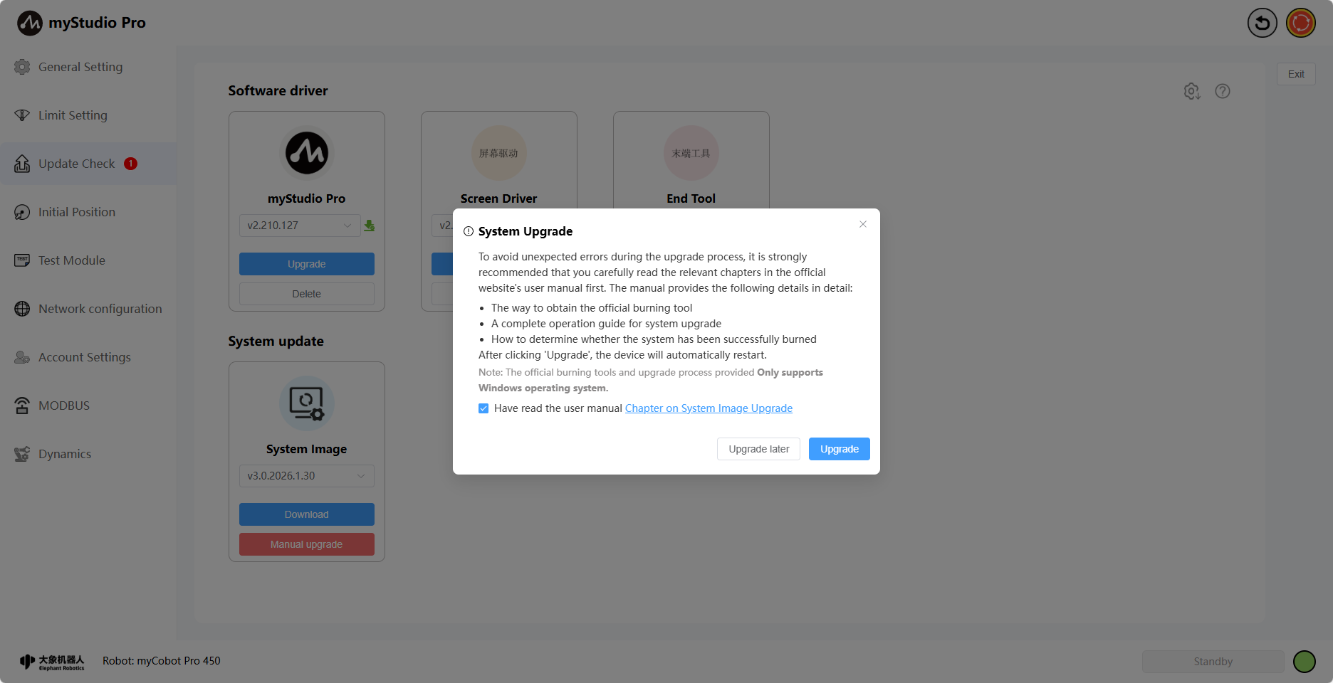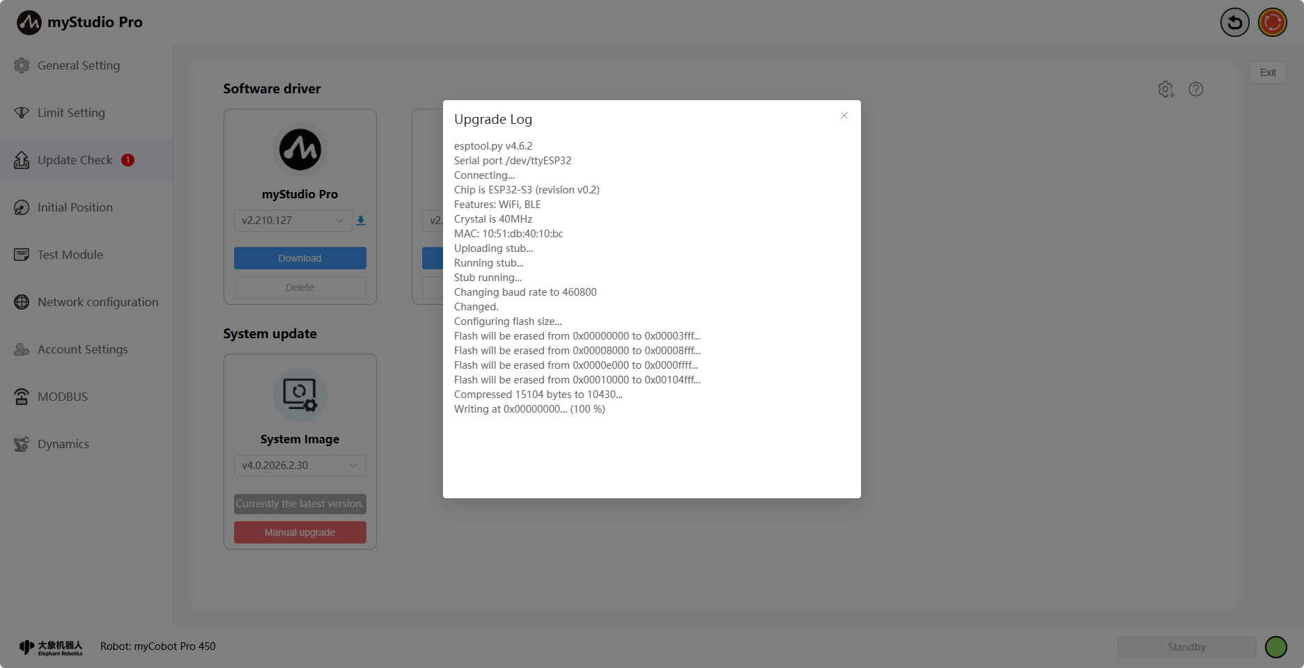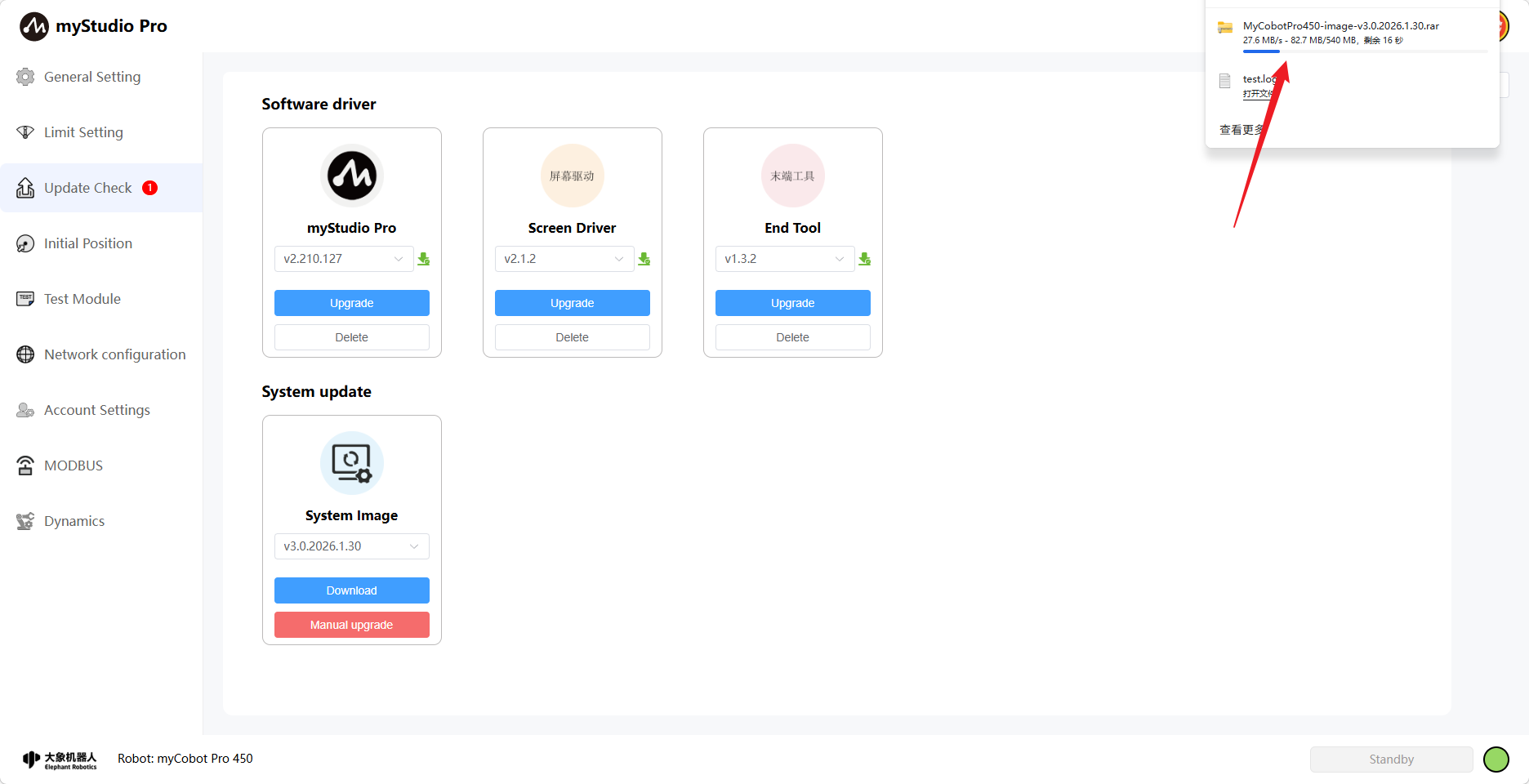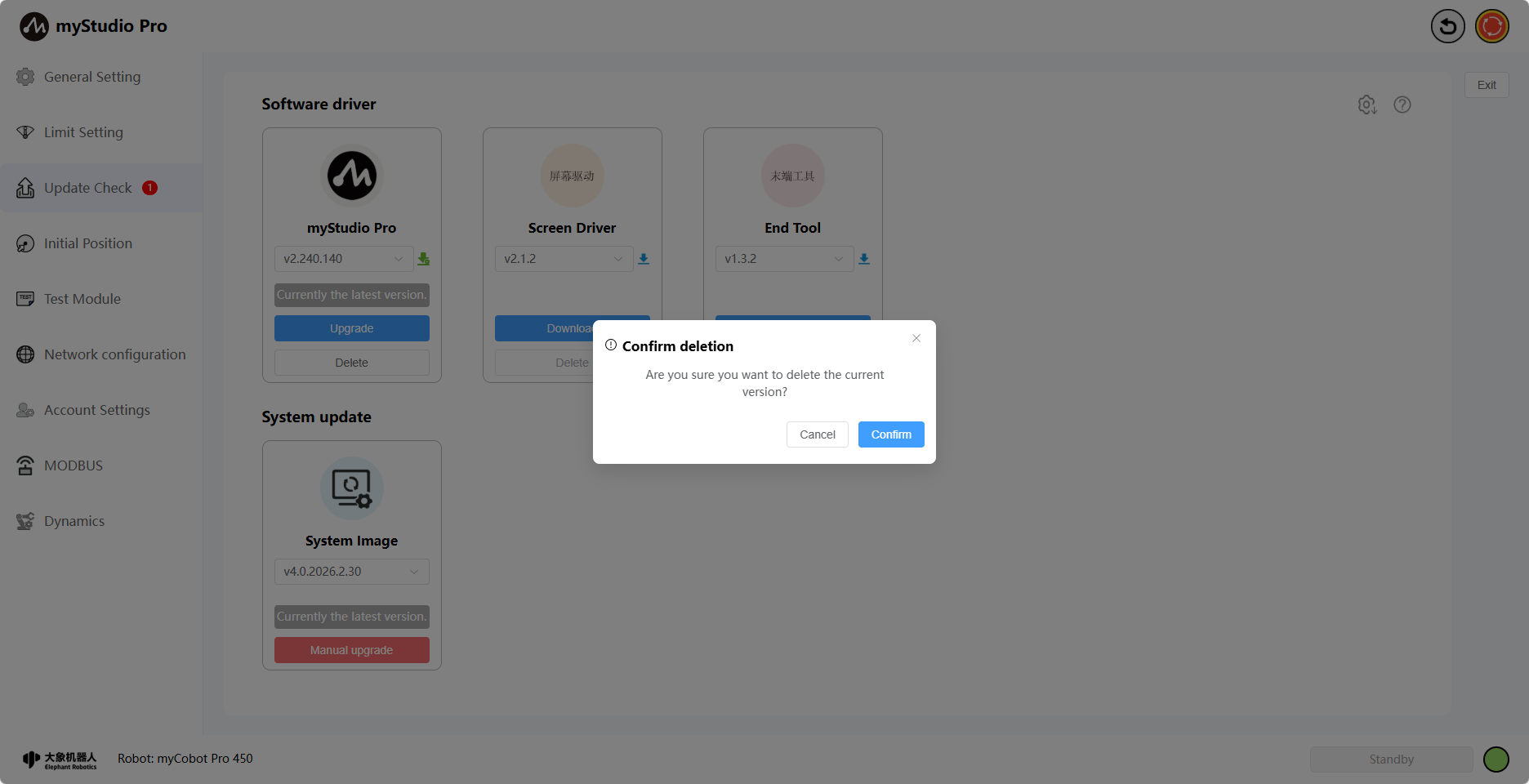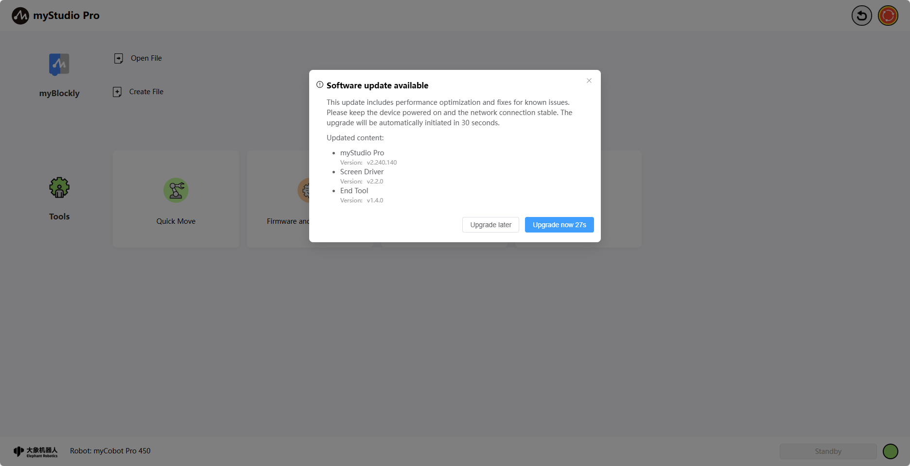 Clicking the Upgrade button will bring up the update details, the current version of the robotic arm, and the latest version.