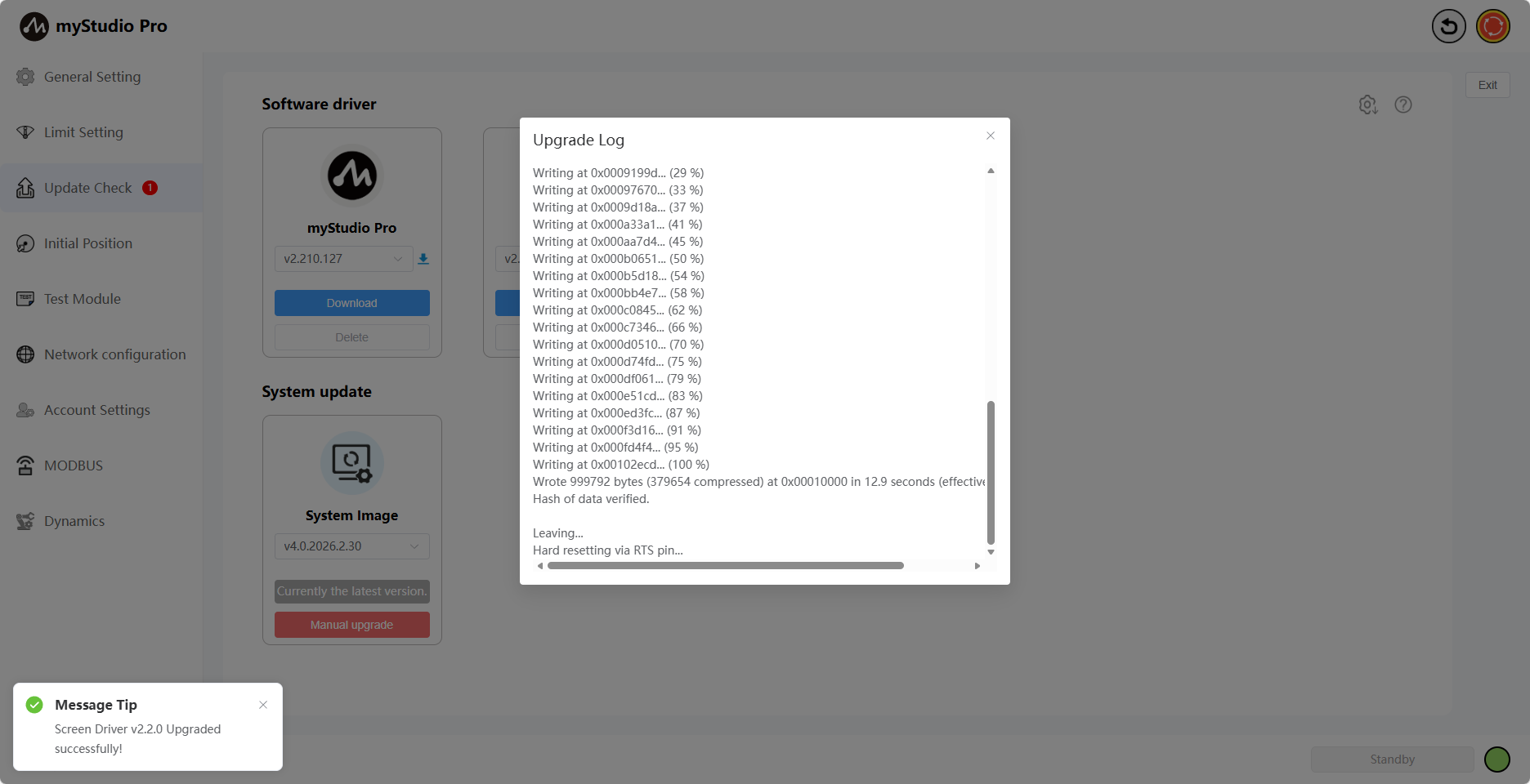 Clicking the Confirm button in the pop-up window will begin the screen driver upgrade. During this time, the robotic arm screen will go black, and the page will display the upgrade log in real time. A corresponding message will be displayed upon completion of the upgrade.
