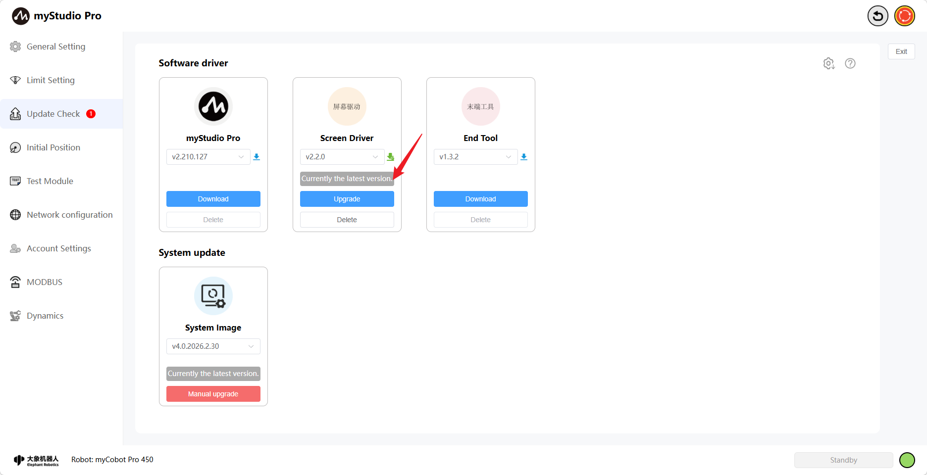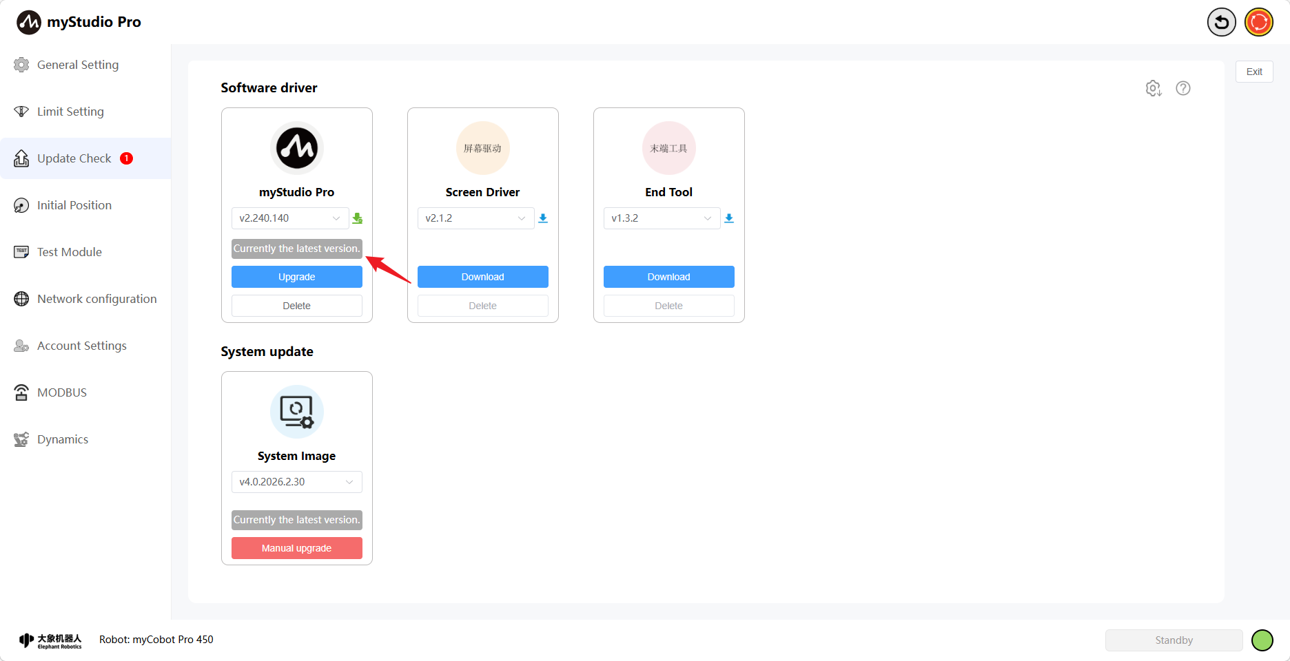 When the robotic arm has been upgraded to the latest version, the text "Currently the latest version" will be displayed.