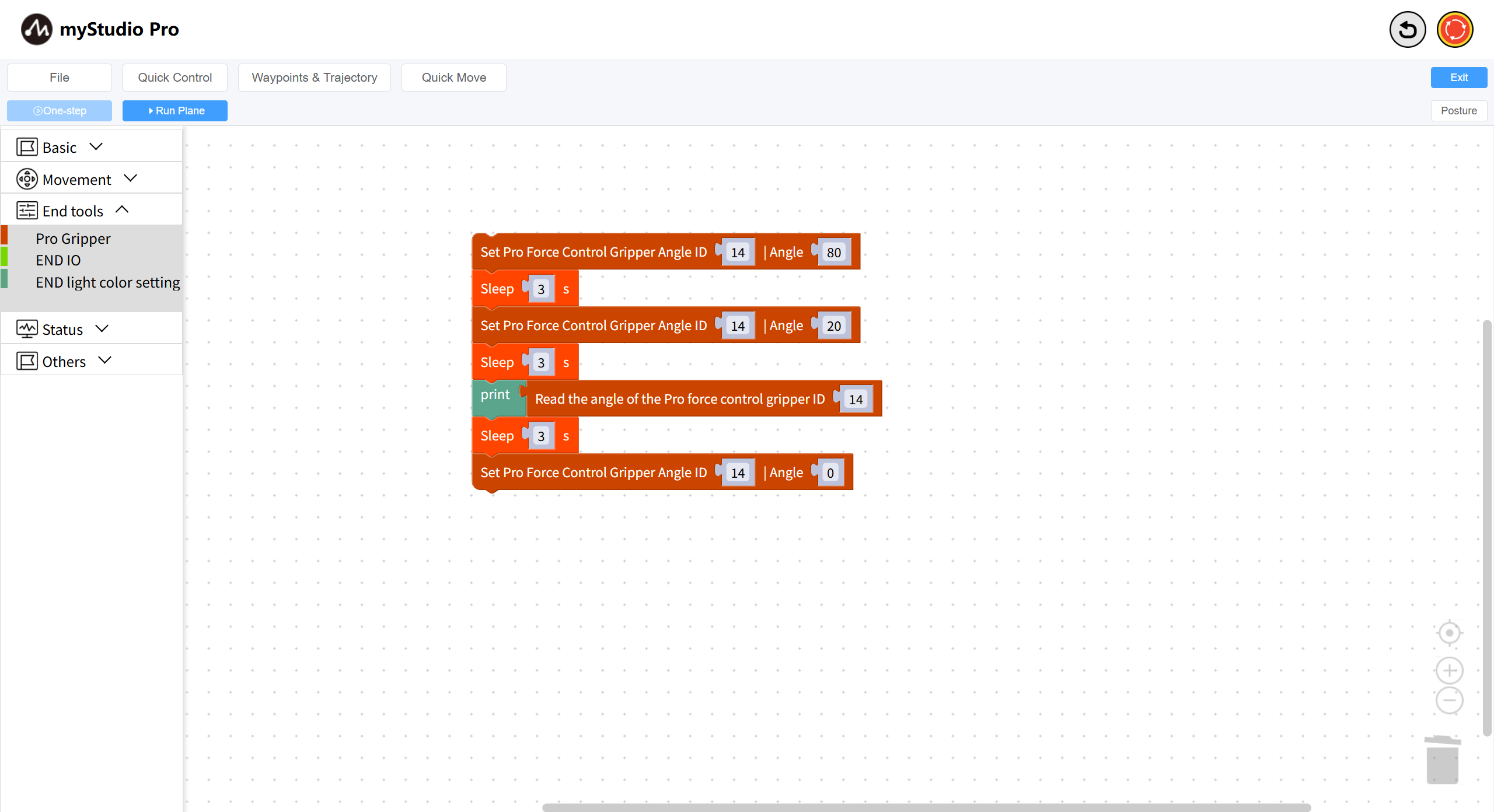 - Gripper Angle parameter: Indicates the desired angle, with a range of 0 to 100.