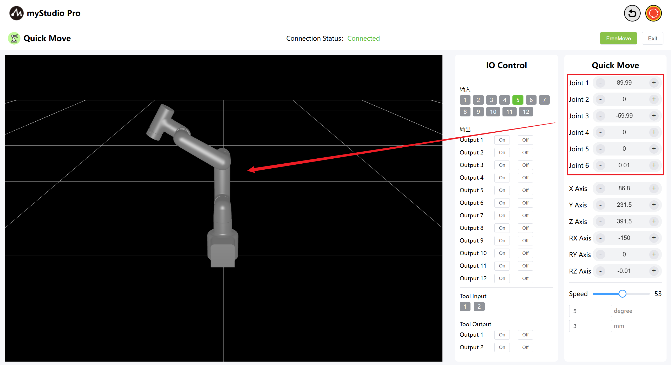buttons to control the joint angles of the robotic arm. The values represent the current joint angles of the robotic arm. You can also directly modify the values to control the joints.
