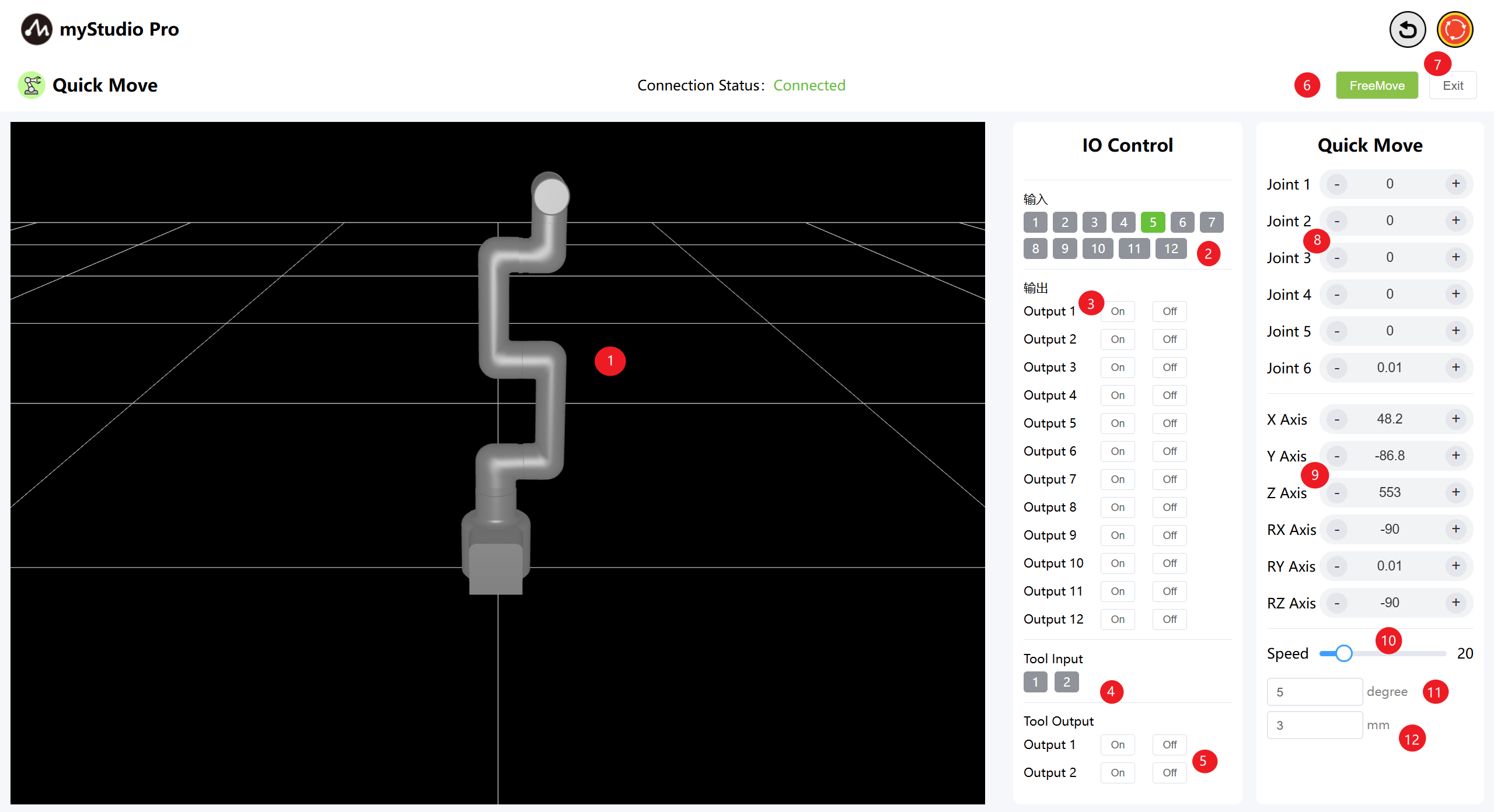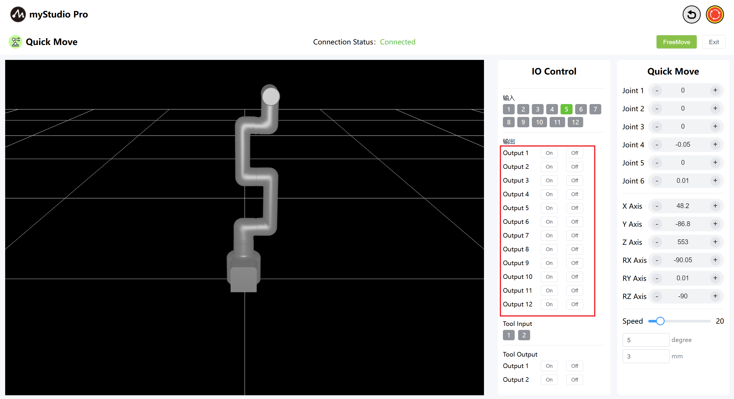 Set the output of the bottom IO pin numbers 1-12, and users can customize the control actuator. For example, the control grippers and suction pumps can be customized.