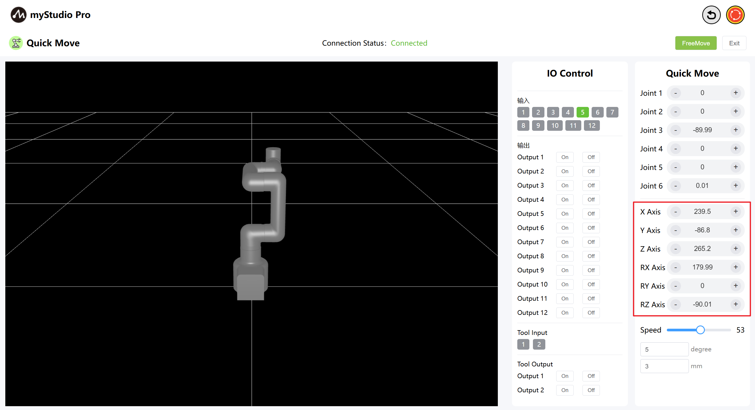 buttons to control the robot arm's coordinates. The values represent the current robot arm's coordinate position information. You can also directly modify the values to control the coordinates.
