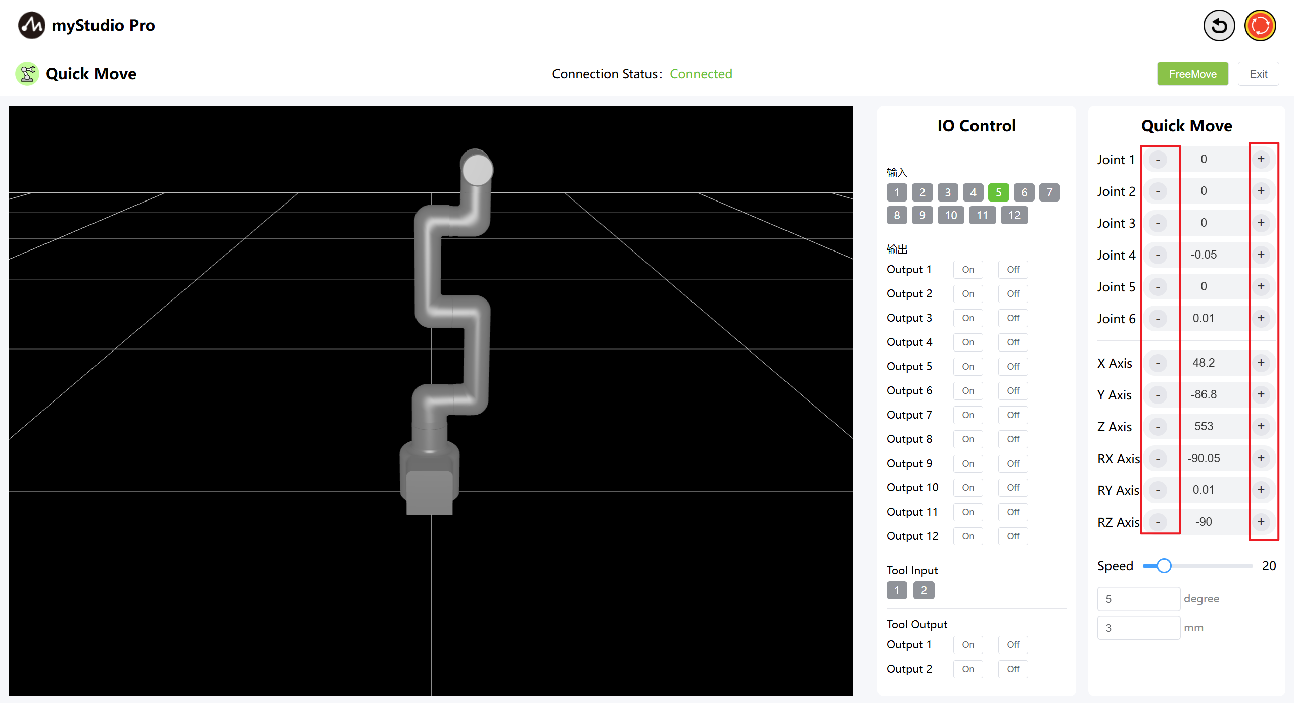 8 | Angle Control: Click the + or - buttons to control the joint angles of the robot arm. The values represent the current joint angle information of the robot arm, and you can also directly modify the values to control the joints. |
