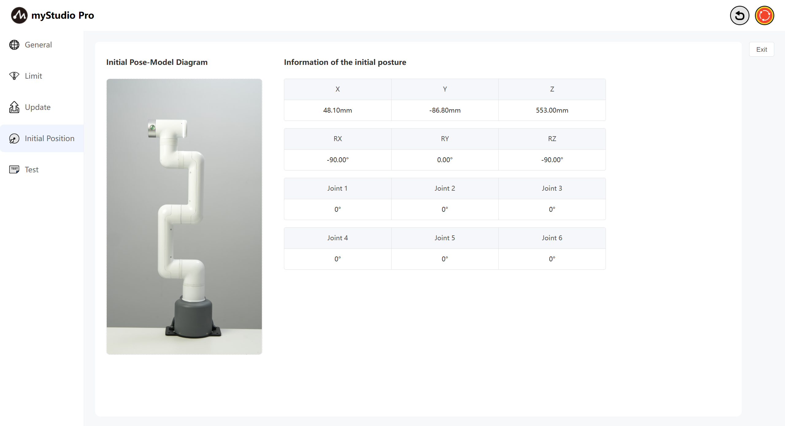 Initial Pose Page: Displays the robot arm's initial pose model, joint angle information, and coordinate pose information.