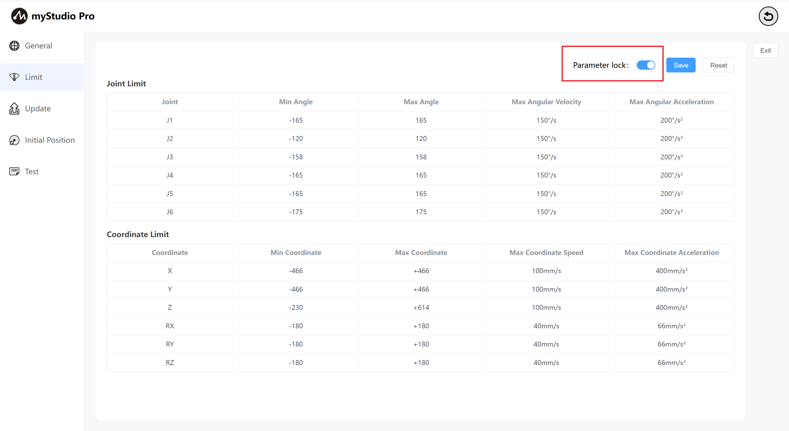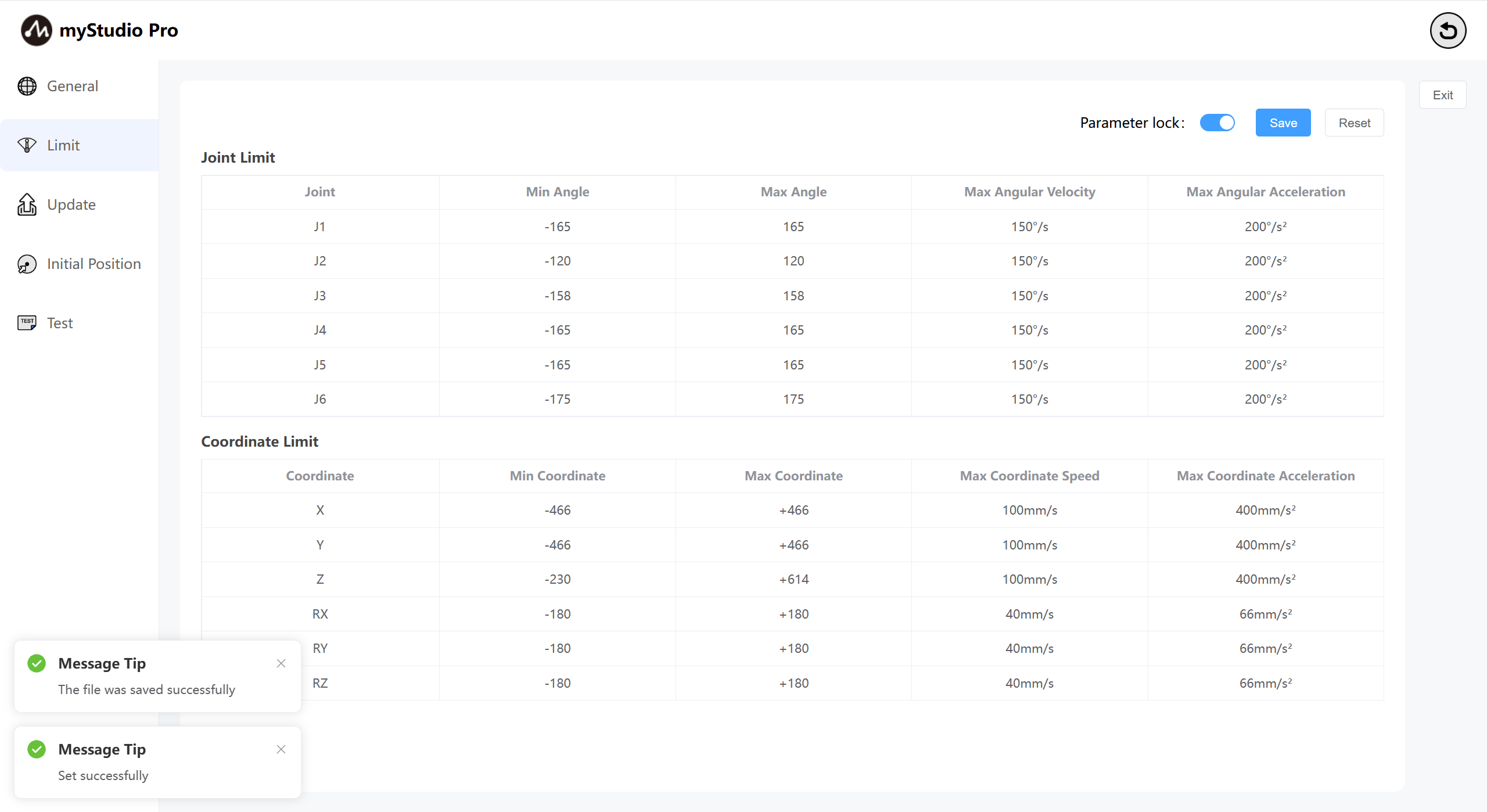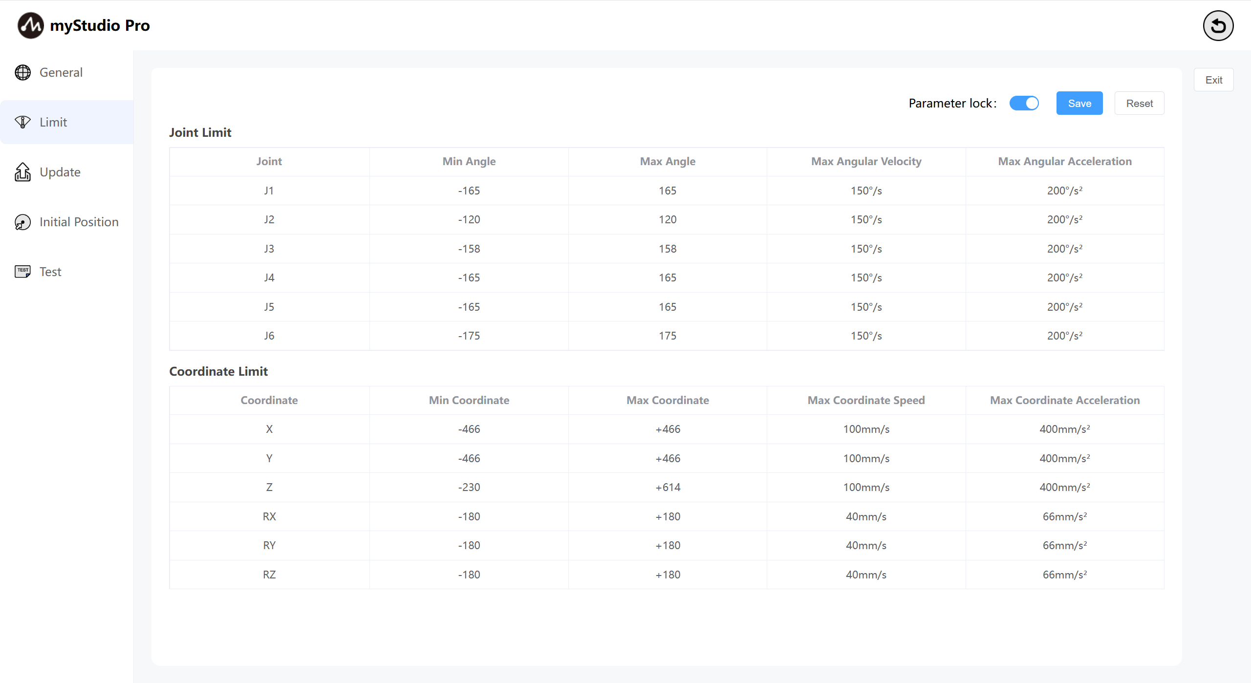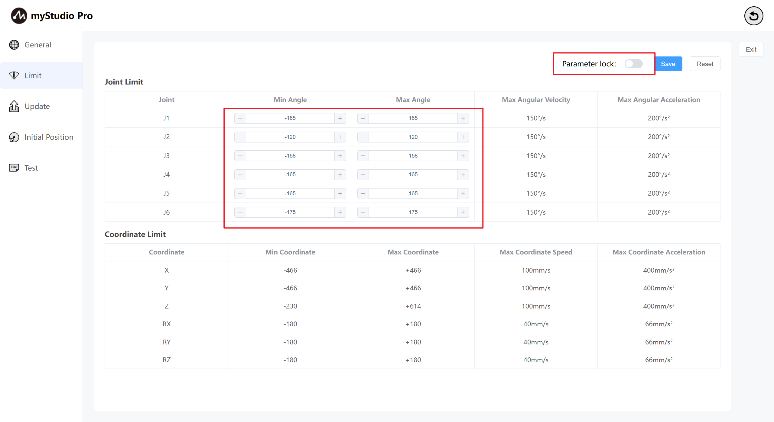Note: Limit parameter modification only supports the minimum and maximum joint angles. Other parameters cannot be modified.