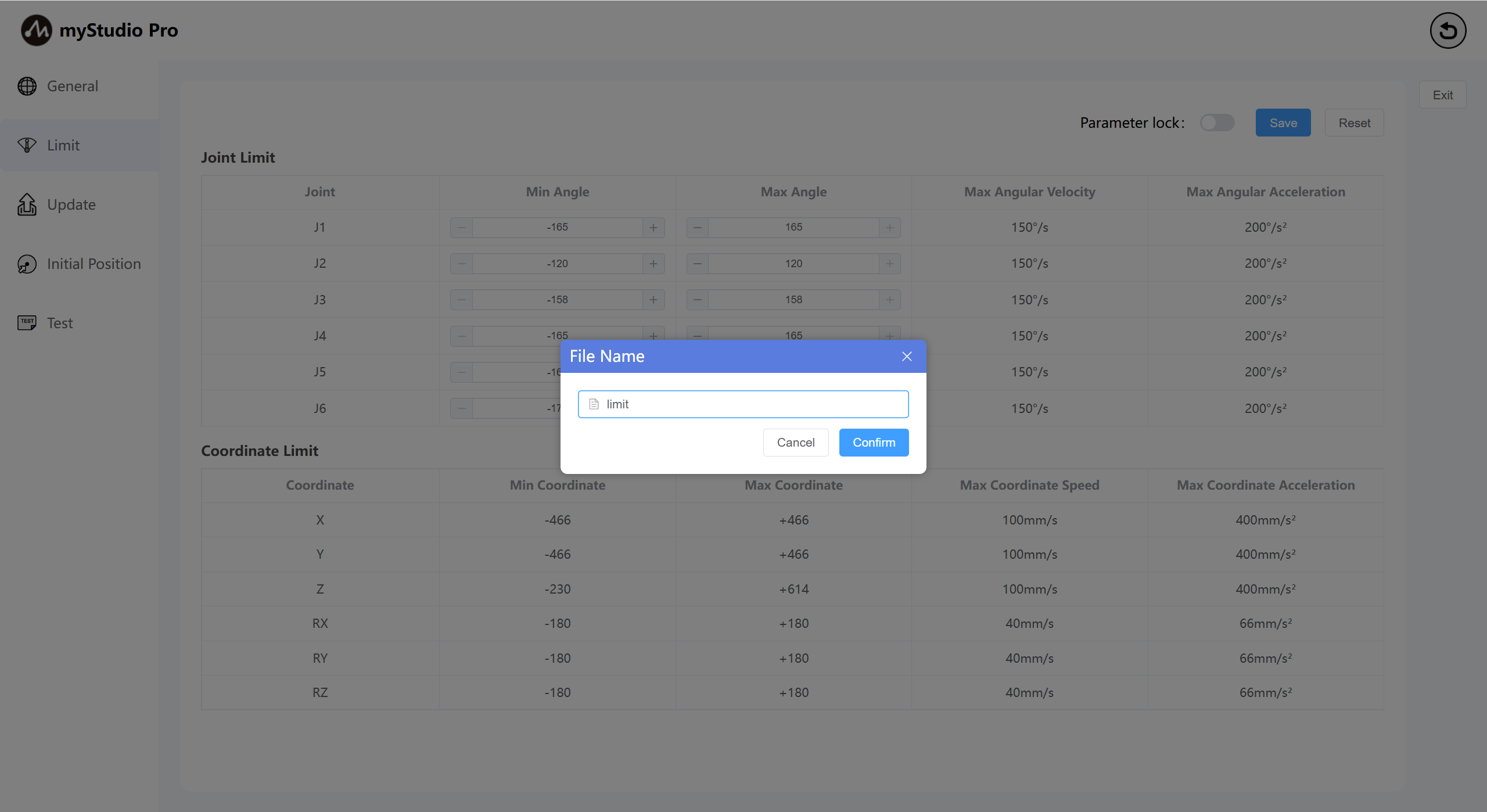 button and define a file name according to the prompts in the pop-up window to save the parameters of the current limit page to a local file (json file) and set the joint limits of the robot arm.