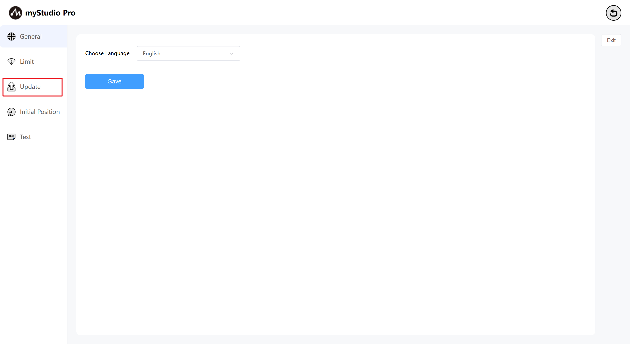 The Update page primarily checks the Atom firmware version status of the robotic arm.