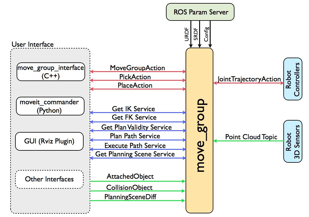 The following figure shows the high-level structure of the main node move_group provided by MoveIt. It acts as a combiner: it brings together all the individual components to provide users with a range of operations and services.
