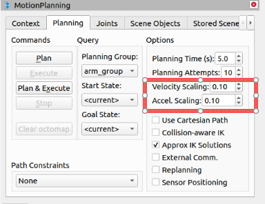 In the Moveit RViz interface, modify the velocity and acceleration scaling. In this case, change it to 0.1 and save the current configuration.
