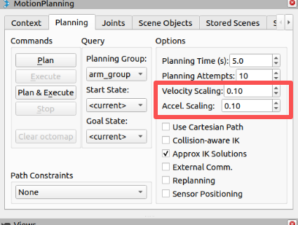 - In the Moveit RViz interface, modify the velocity and acceleration scaling. Here, change it to 0.1 and save the current configuration.